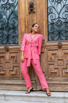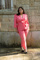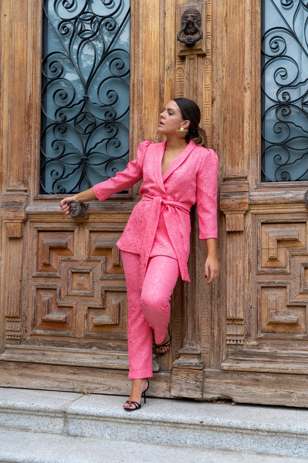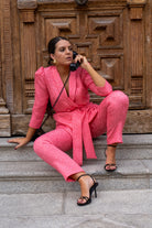 Set consisting of a three-quarter sleeve jacket with a center button closure, belt, and straight-leg trousers with a waistband, back zipper. In pink with brocade.