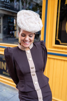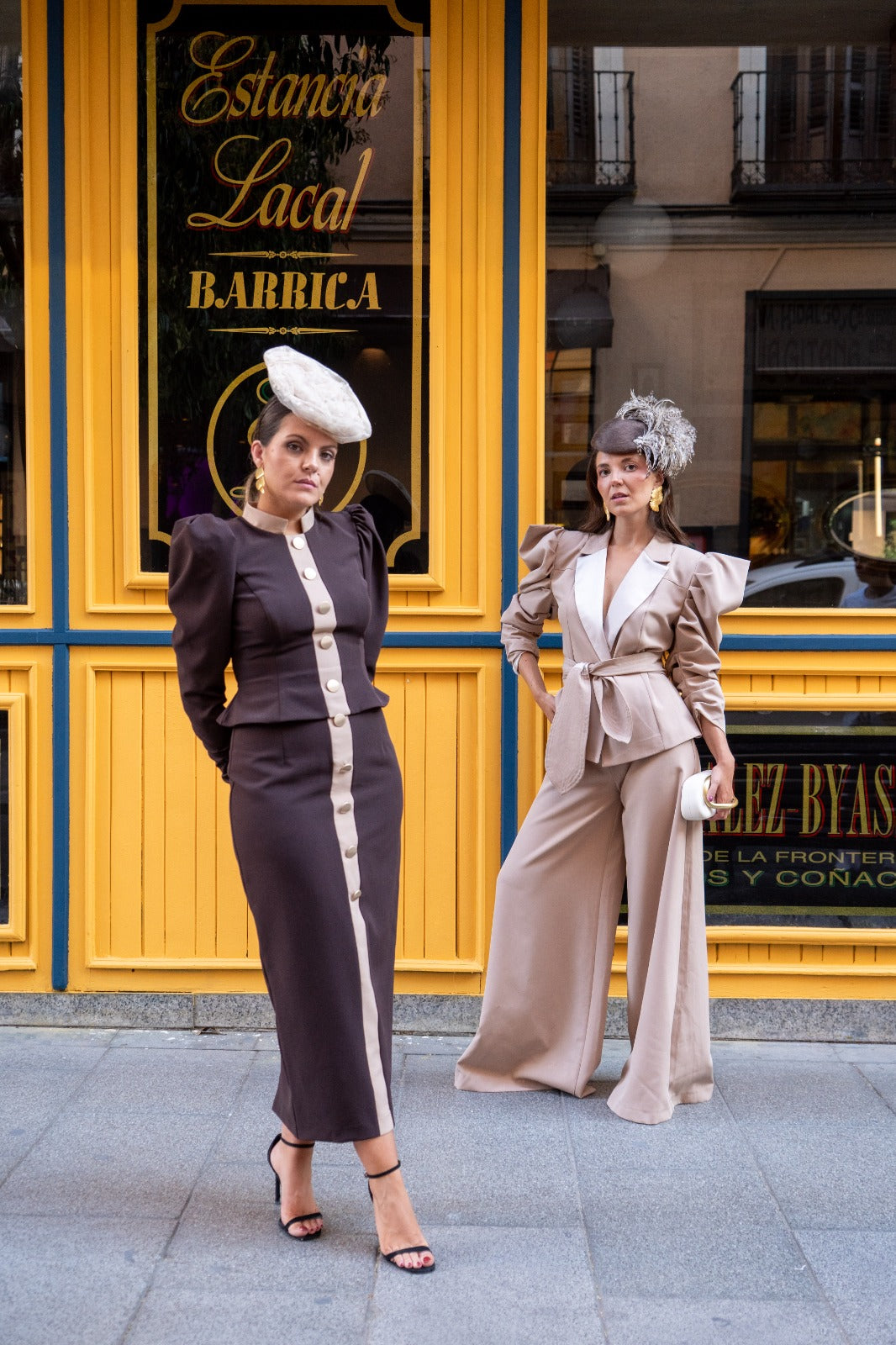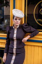 Set consisting of a jacket with a high collar, puffed sleeves with gathered cuffs, front button detailing (they don't open), and a high, straight skirt with front button detailing. Two-tone brown and beige.