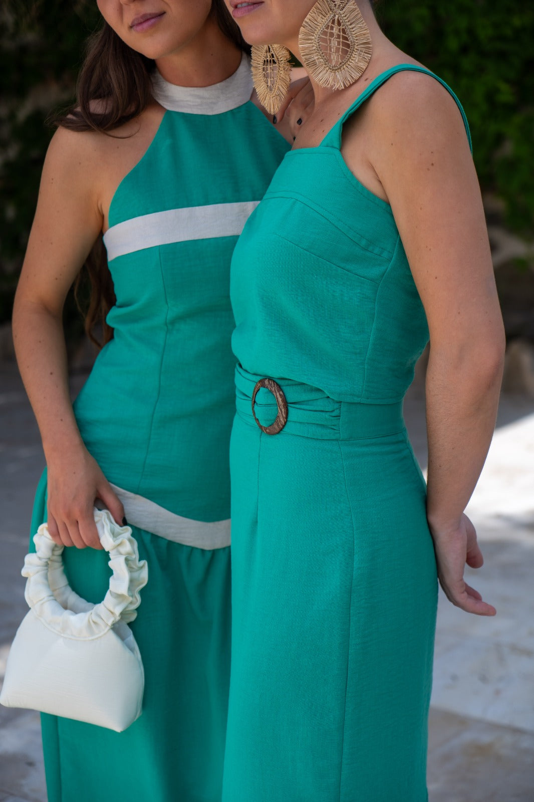 Set featuring a square-neck top, wide shoulder pads, and a high-waisted skirt with buckle detailing and a slit in the back. In green.