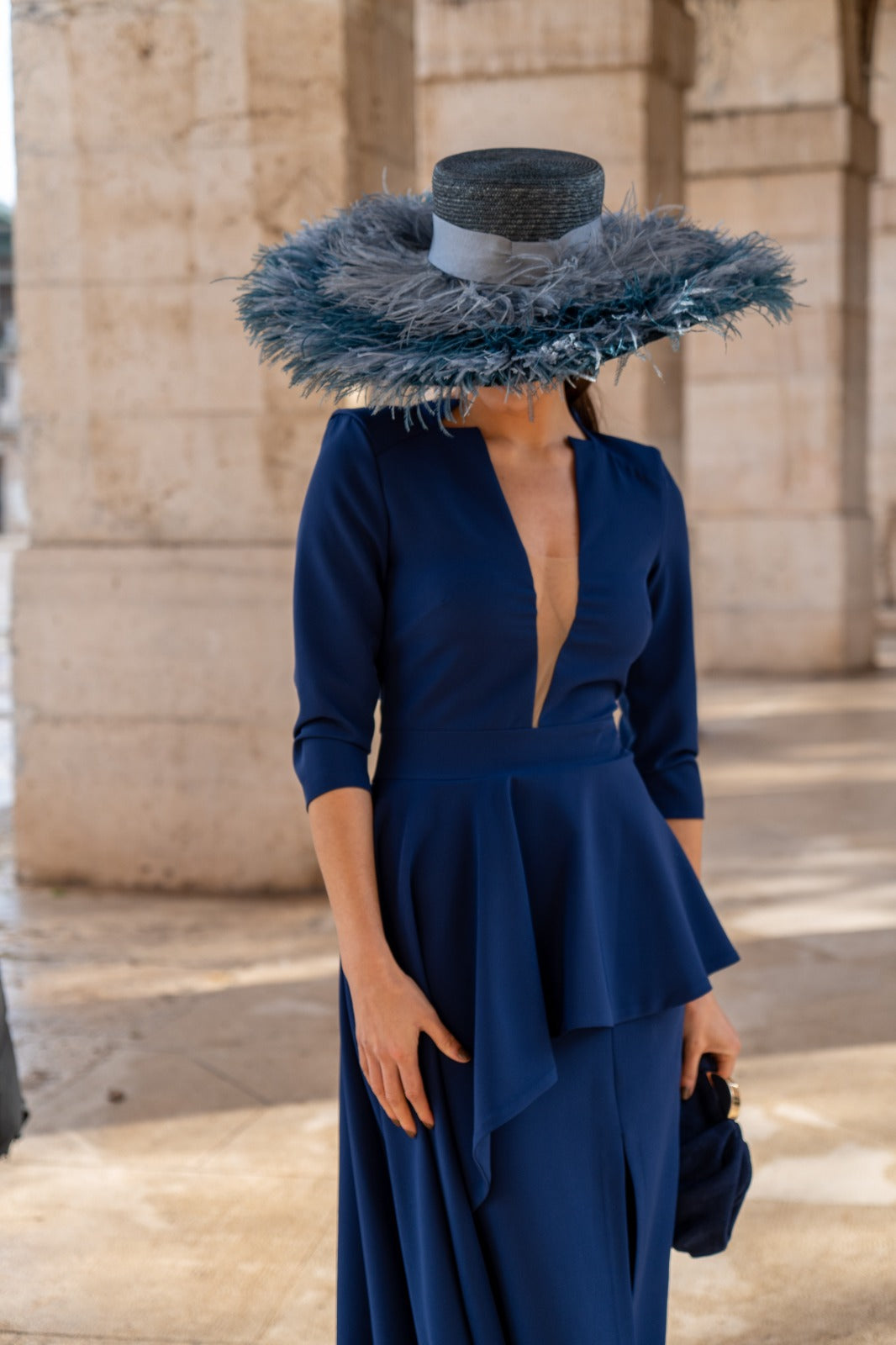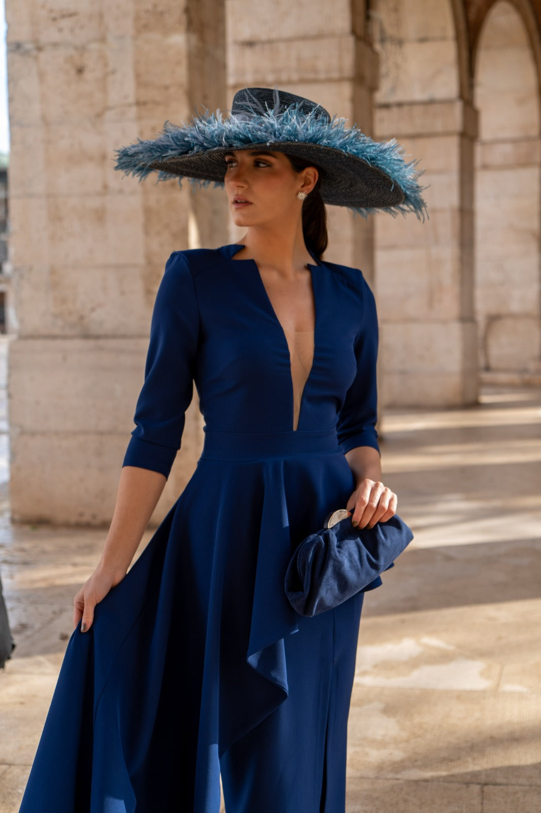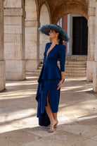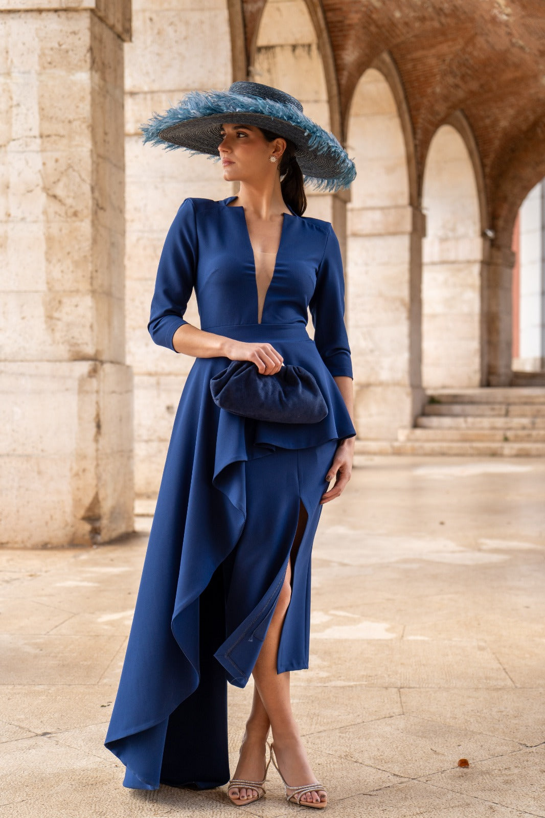 Midi dress, V-neck with detail at the neck, three-quarter sleeves, front slit, over a long side skirt with peplum. In blue.