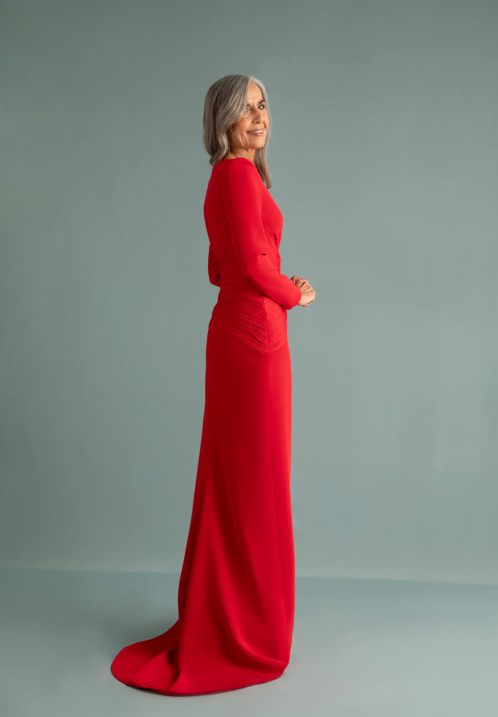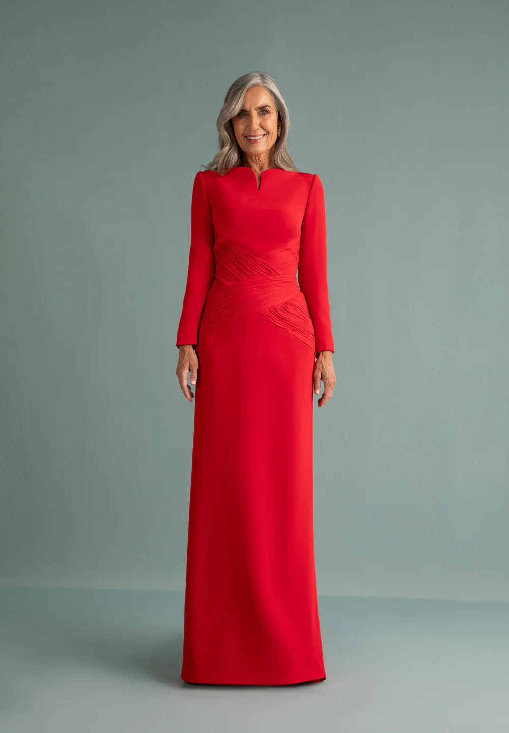 Dress in triacetate with V-shaped opening in the neckline and long sleeve. Hand-woven georgette drape that crosses the front and back. In red.
