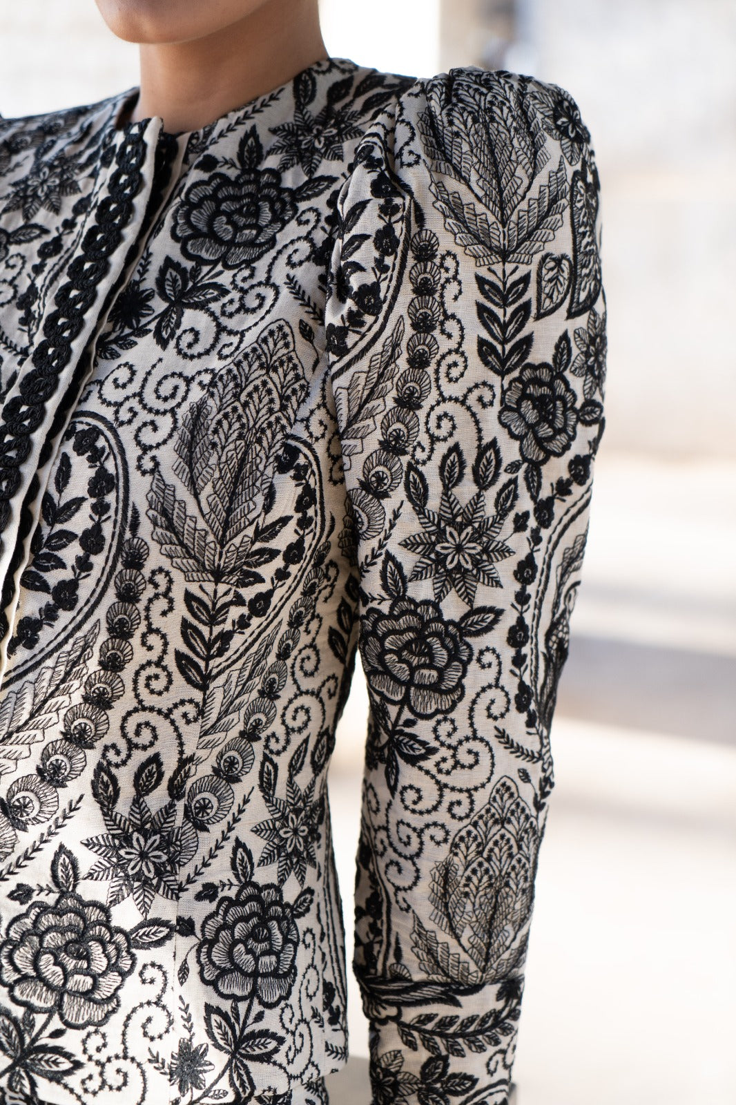 Conjunto compuesto por chaqueta confeccionada en tejido bordado artesanal, con diseño floral en contraste, hombros ligeramente estructurados, manga larga y corte entallado. Pantalón largo corte recto estiliza la figura, mientras que la caída del tejido aporta comodidad y sofisticación. En color beige y negro.