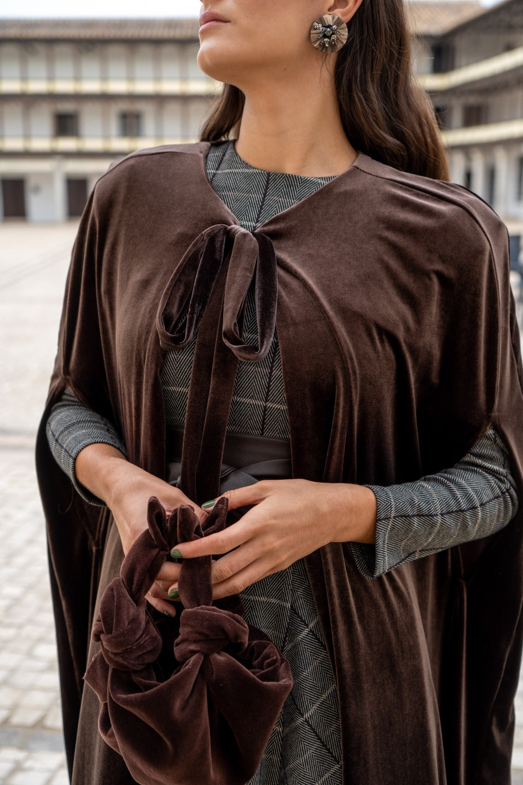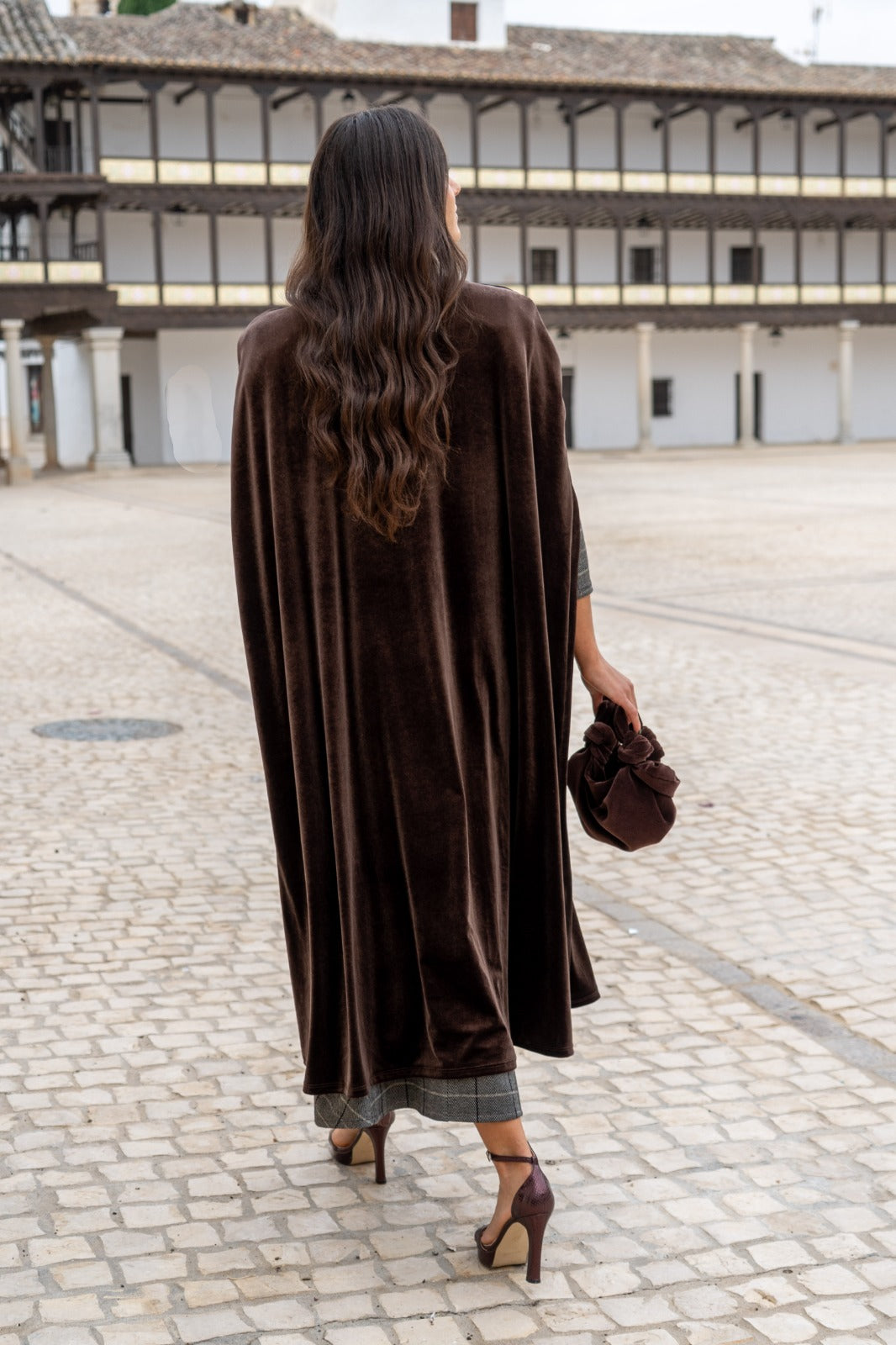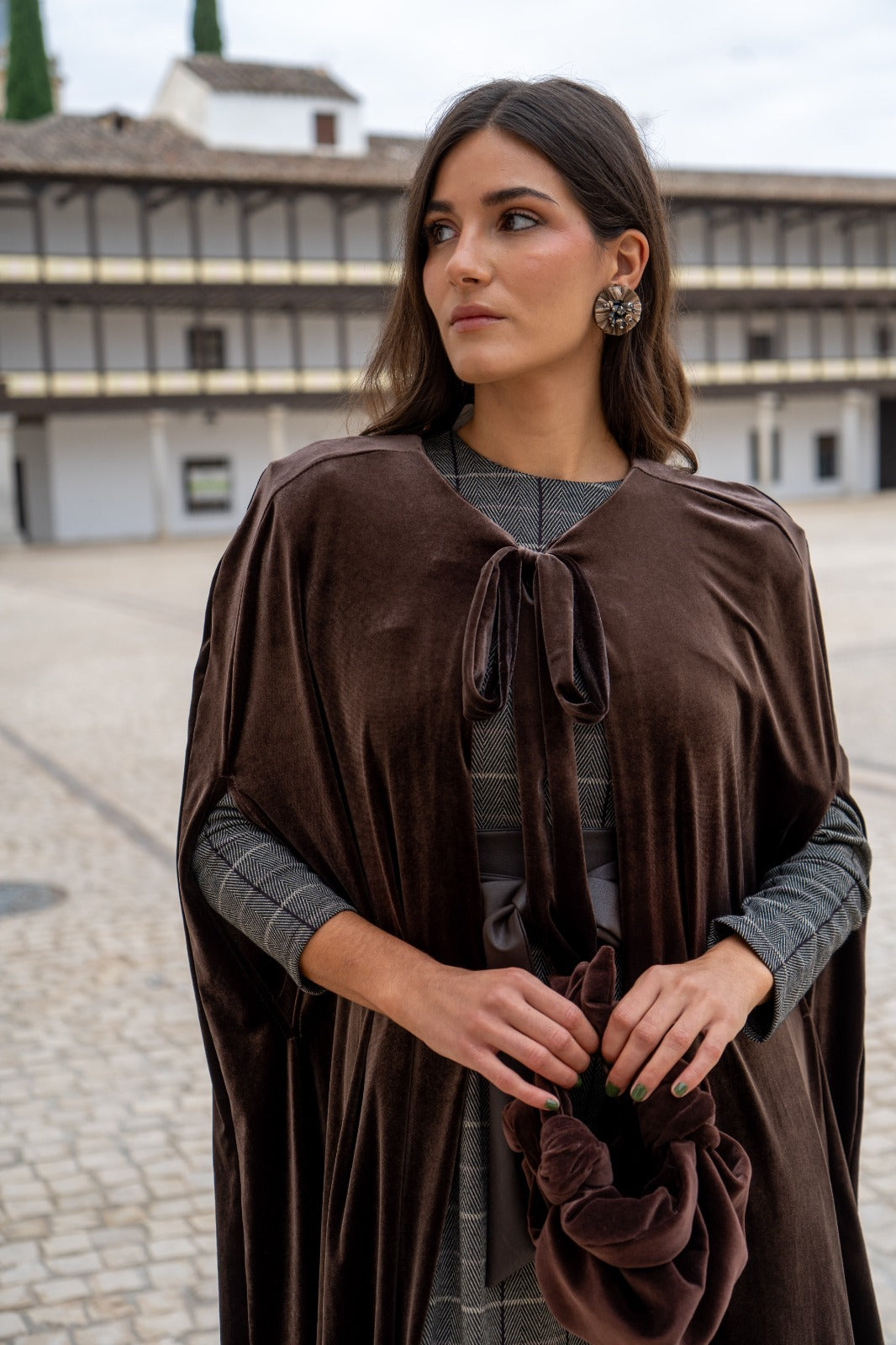 Velvet cape, with openings for the hands, approximately 120cm long, with a tie to fasten at the neck. In brown.