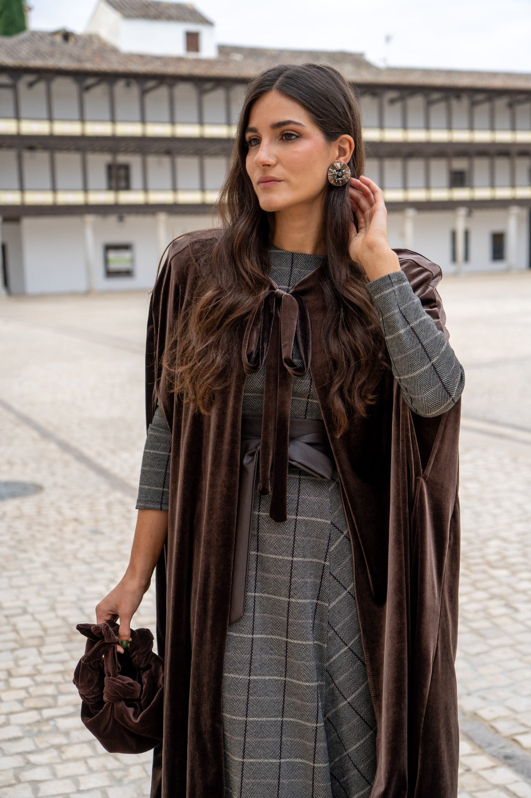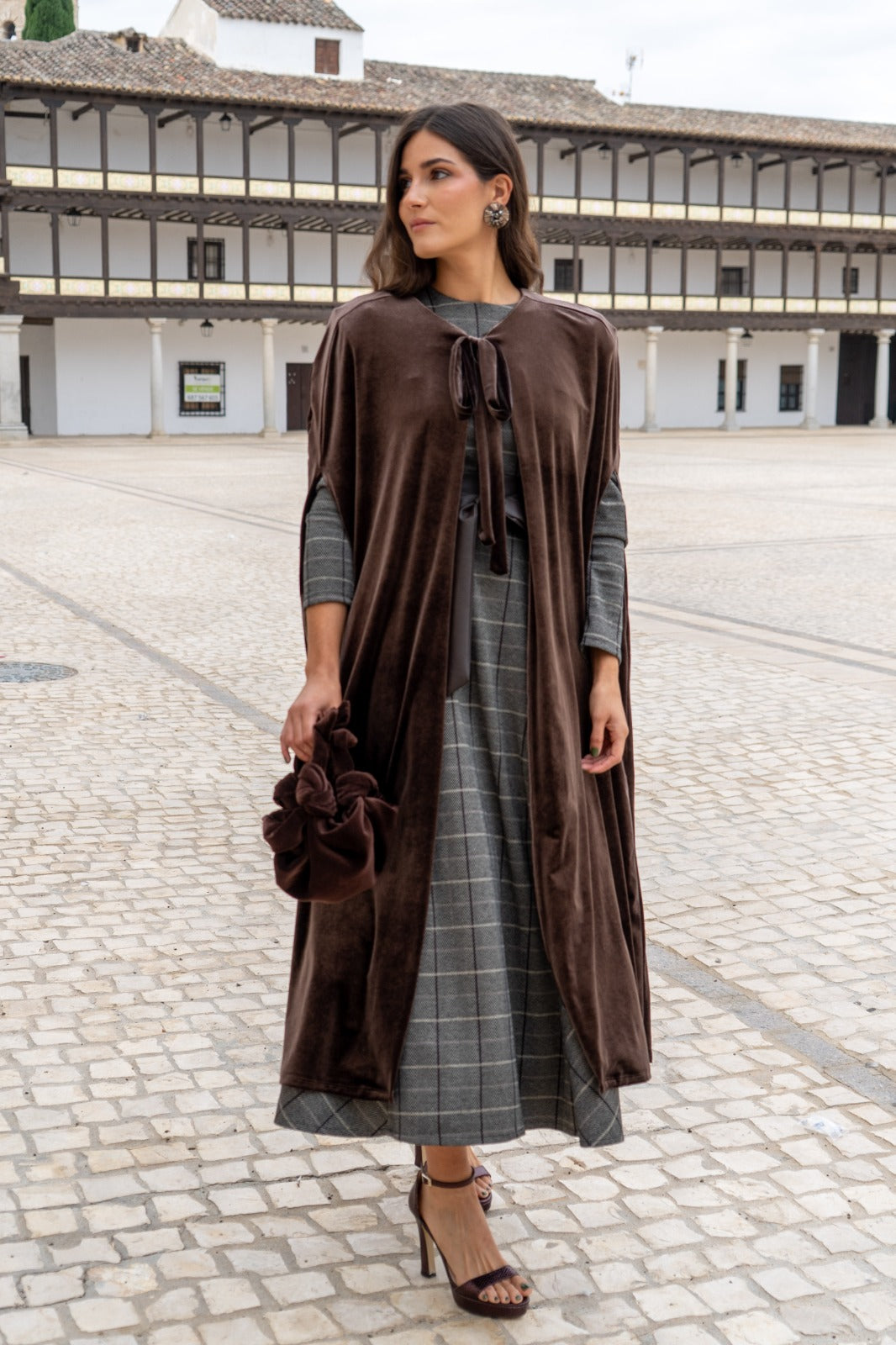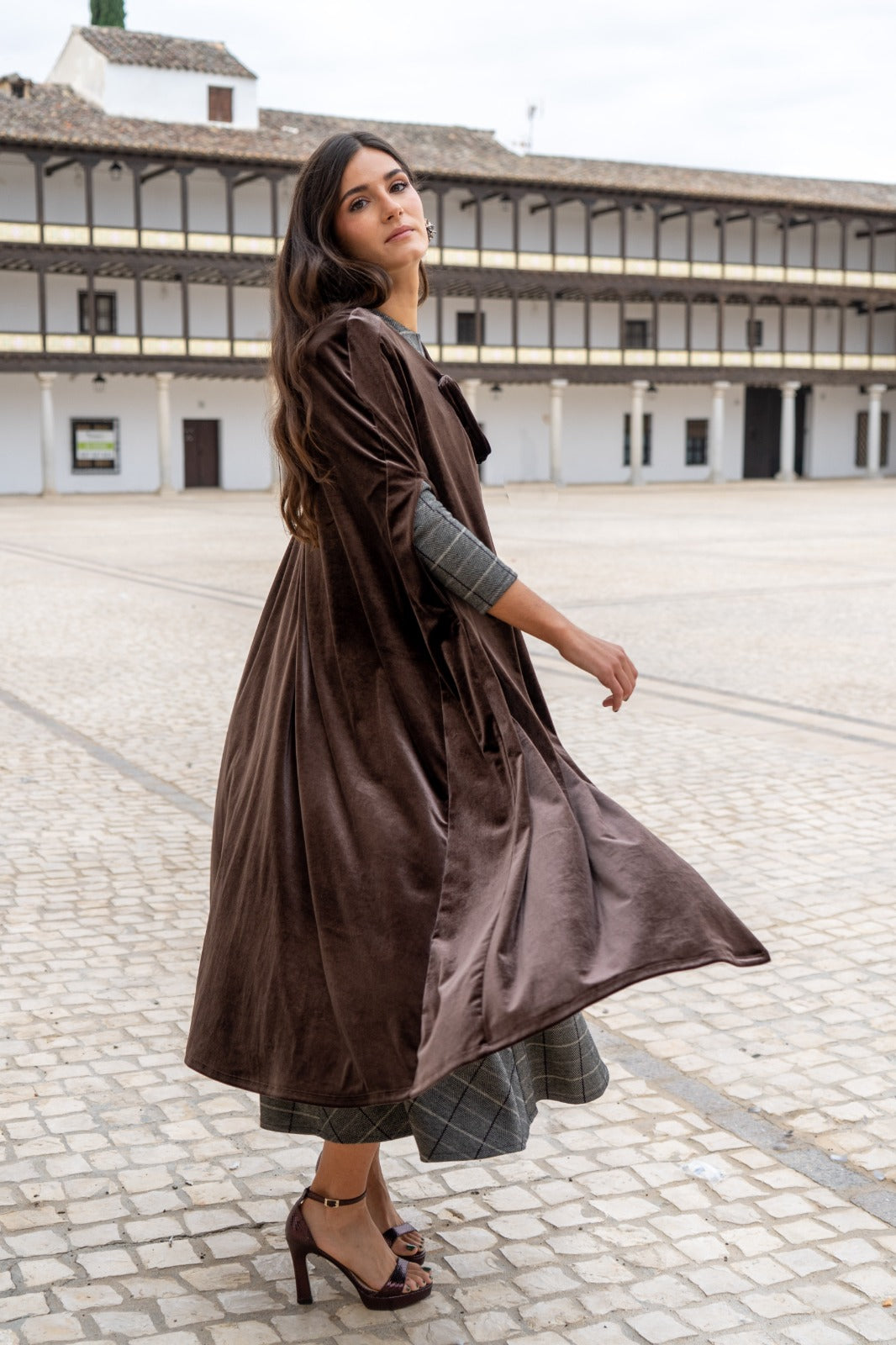 Velvet cape, with openings for the hands, approximately 120cm long, with a tie to fasten at the neck. In brown.