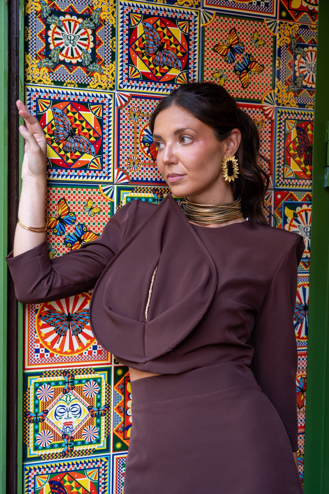 Set featuring a round-neck blouse with a floral detail on the side, a buttoned back, and a high, straight skirt with a slit in the back. In brown.