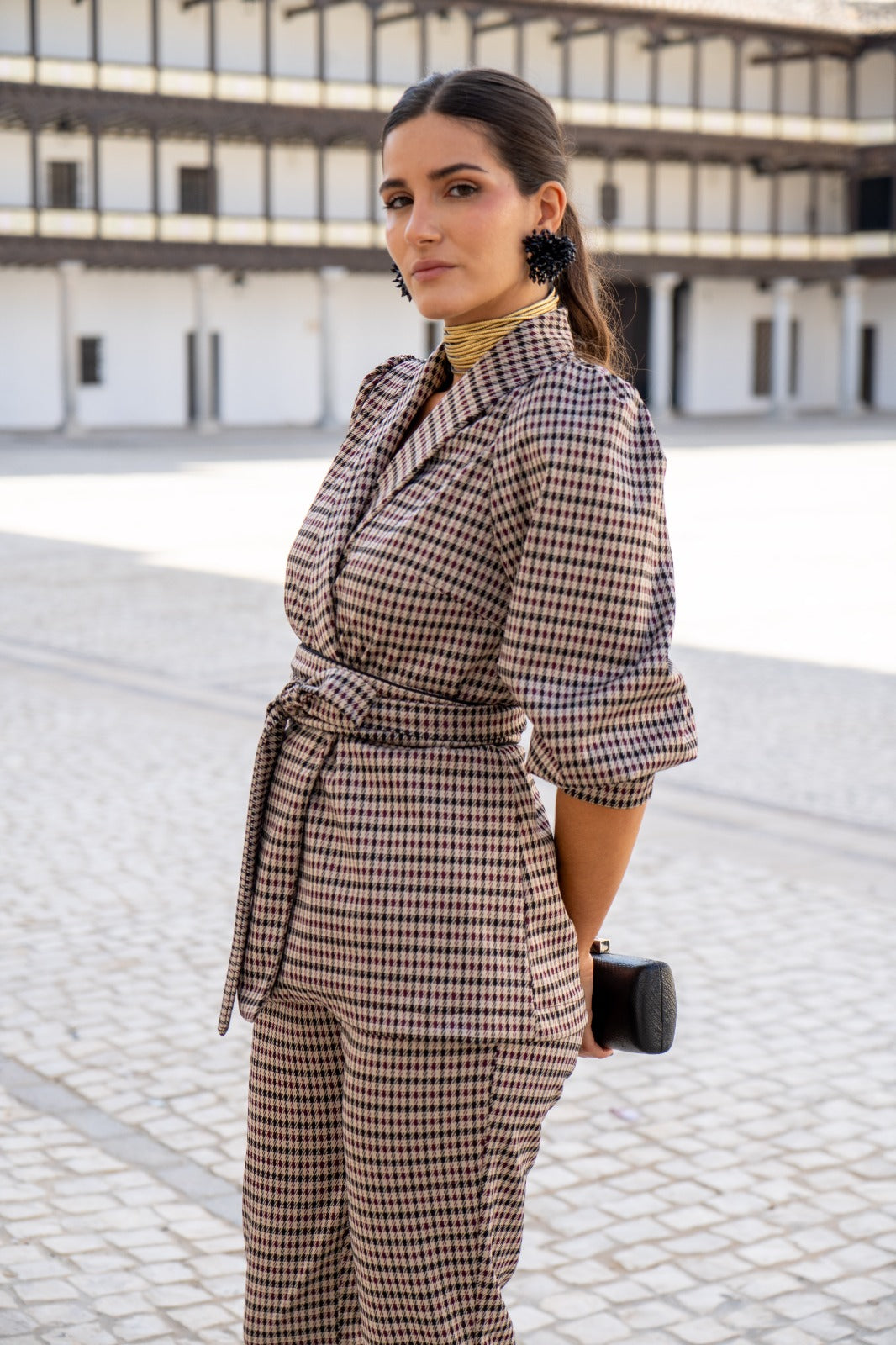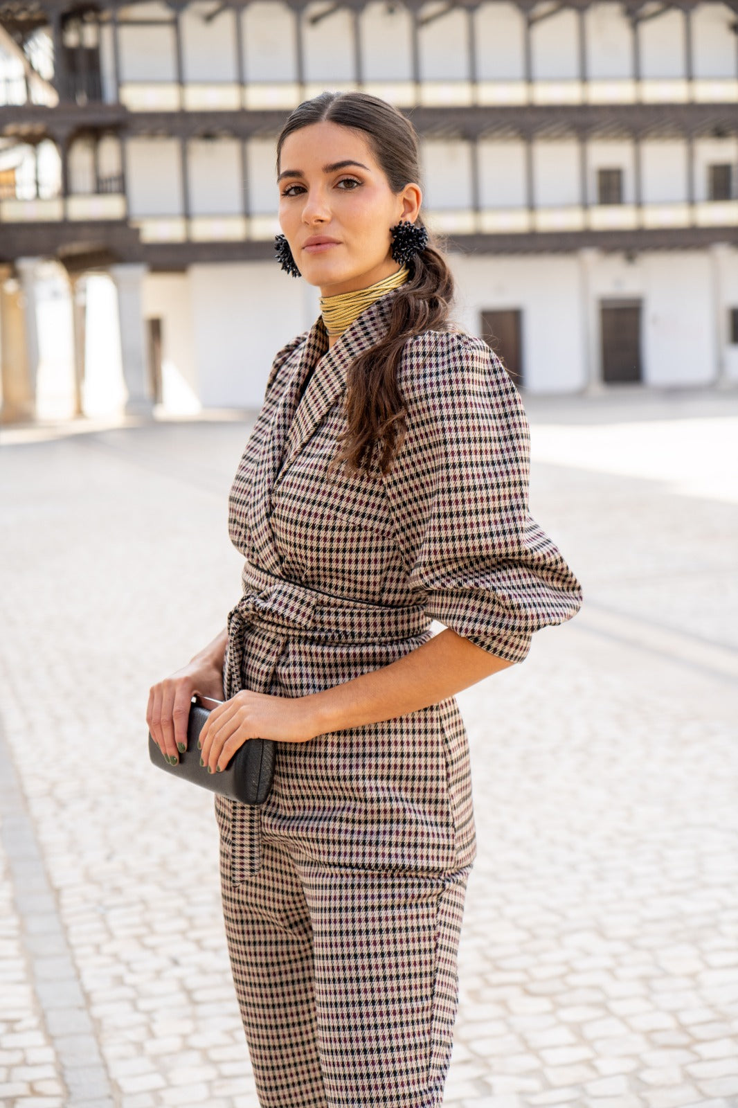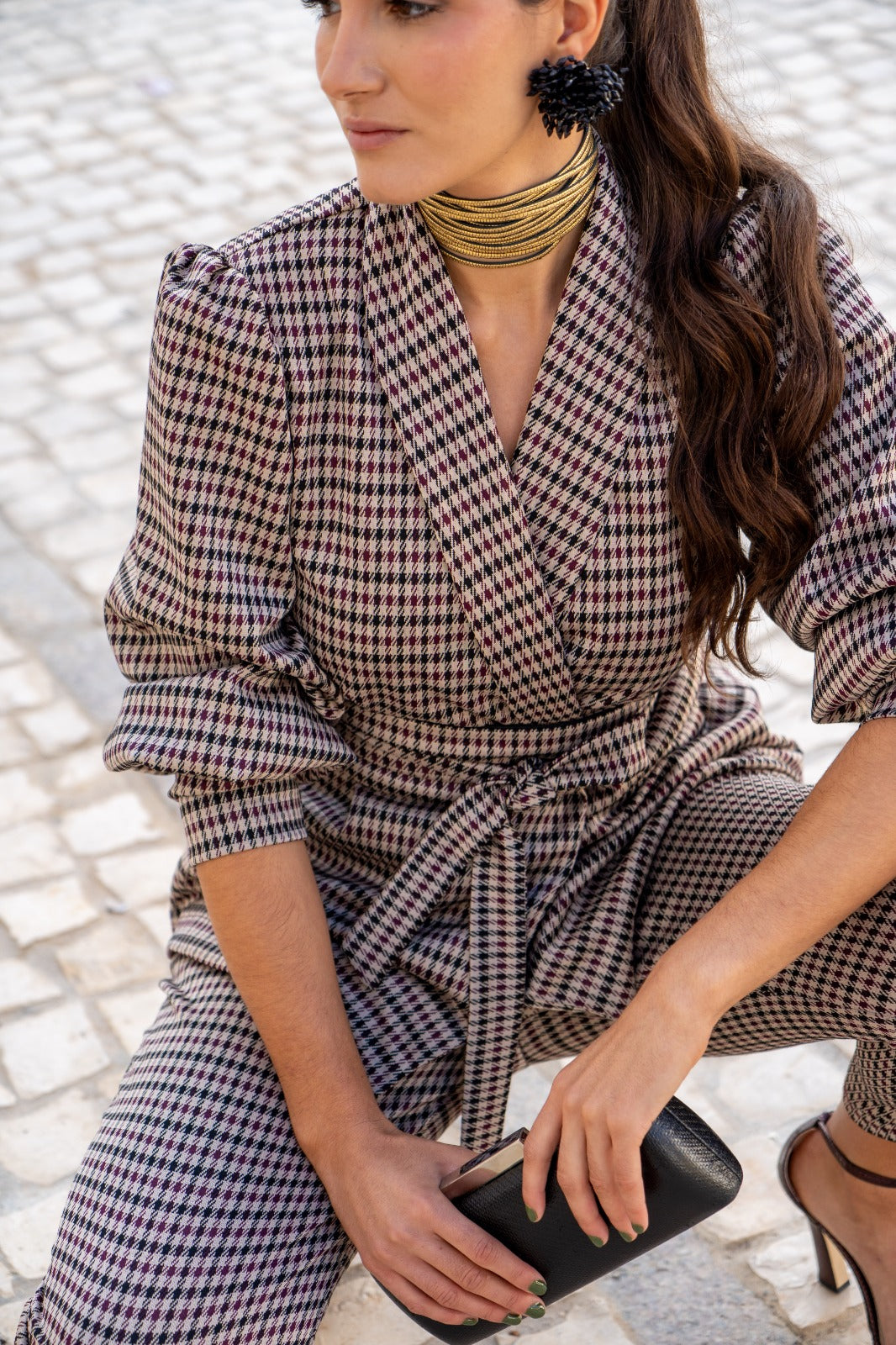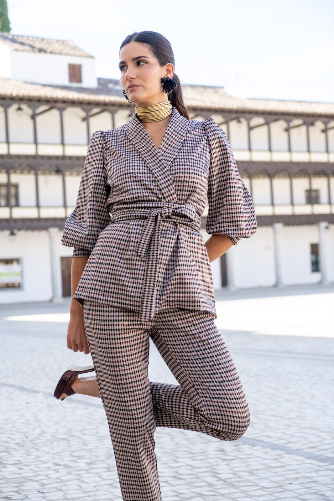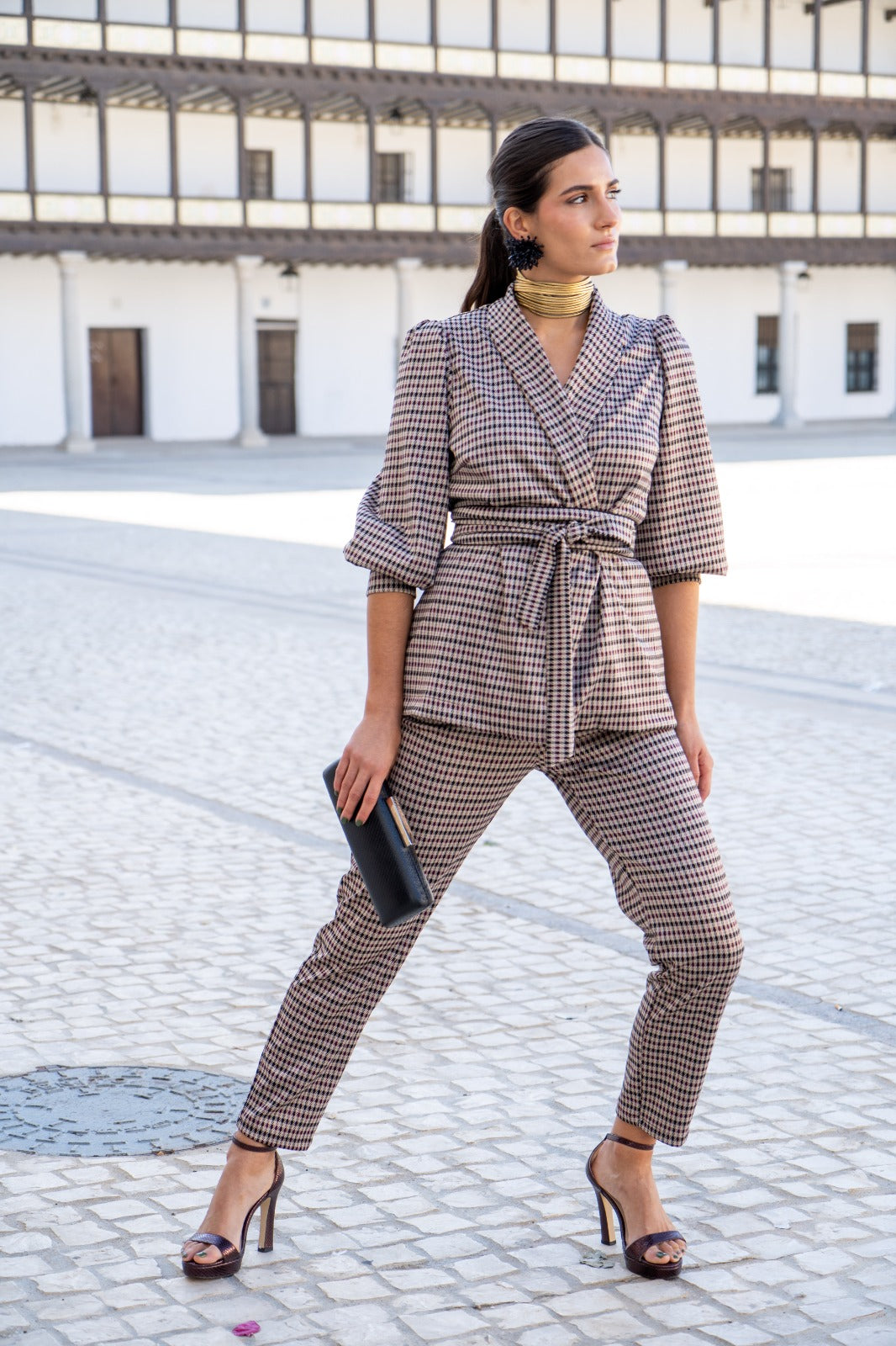 A set consisting of a double-breasted jacket with a lapel collar, belt, puff sleeves with wide cuffs, and high-waisted trousers that are tapered at the bottom. In a multicolored check pattern.