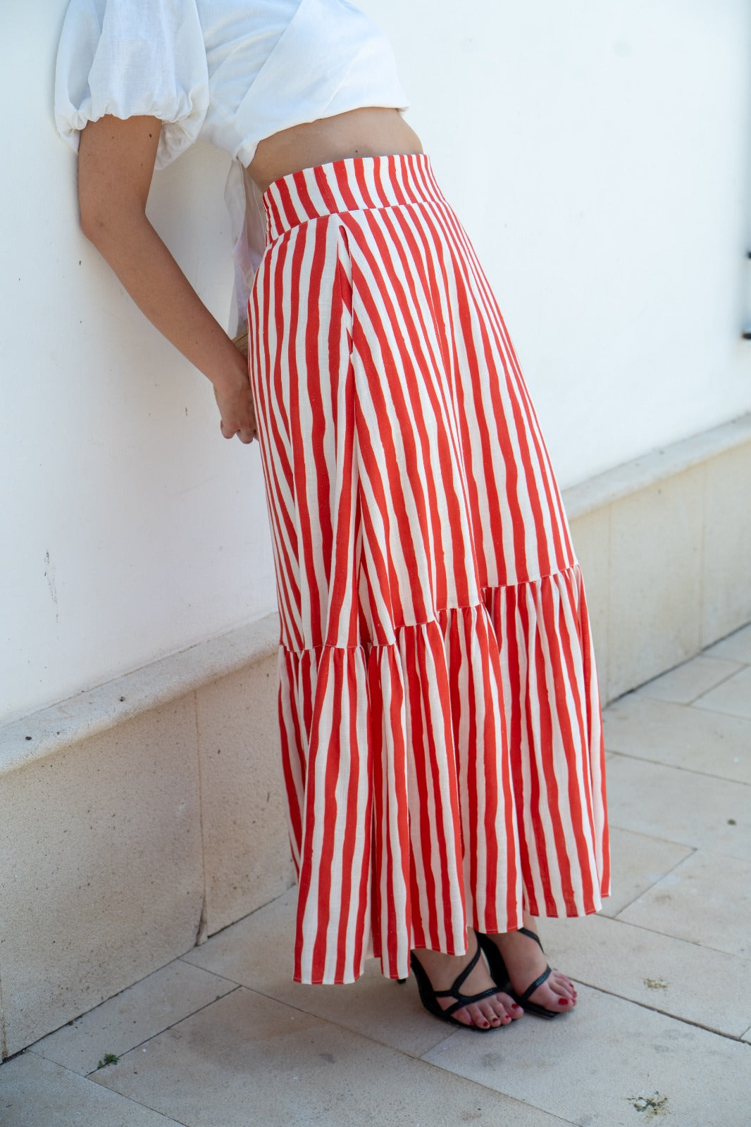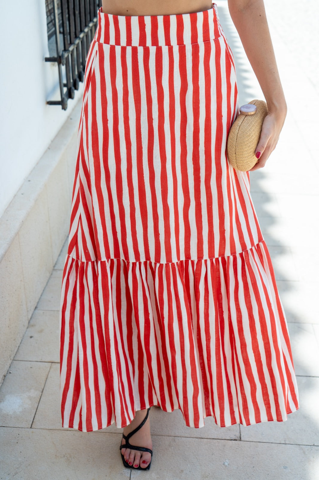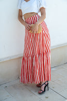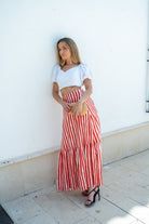 Long skirt, high waist, elasticated back, ruffle at the bottom. In red and white stripes.
