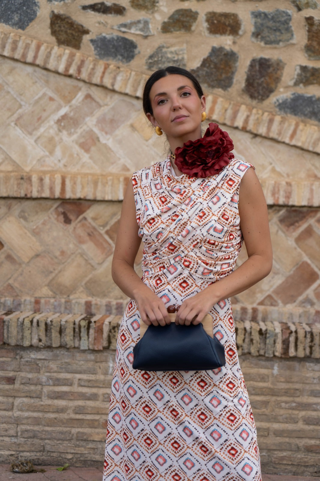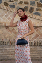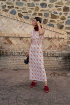 Sleeveless midi dress with a round neckline and crossover at the chest, a cut-out waist, and a flared skirt. In beige with a print.
