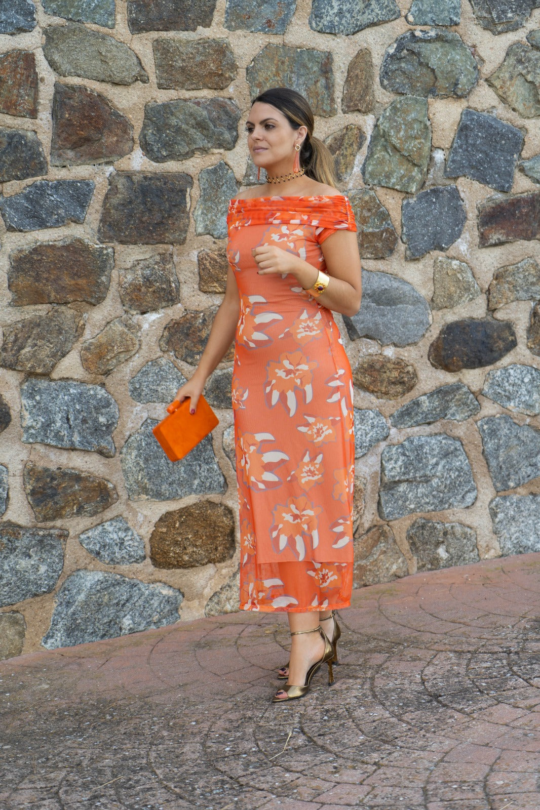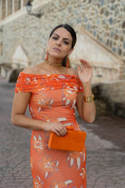 Off-the-shoulder midi dress with short sleeves and a fully elasticated waist. In orange with a print.