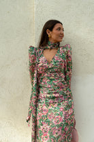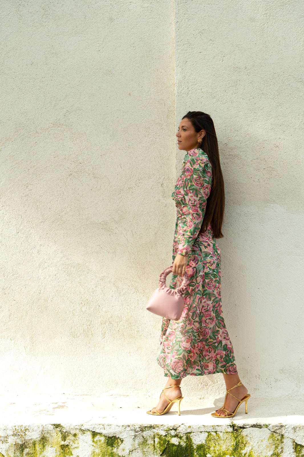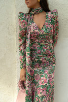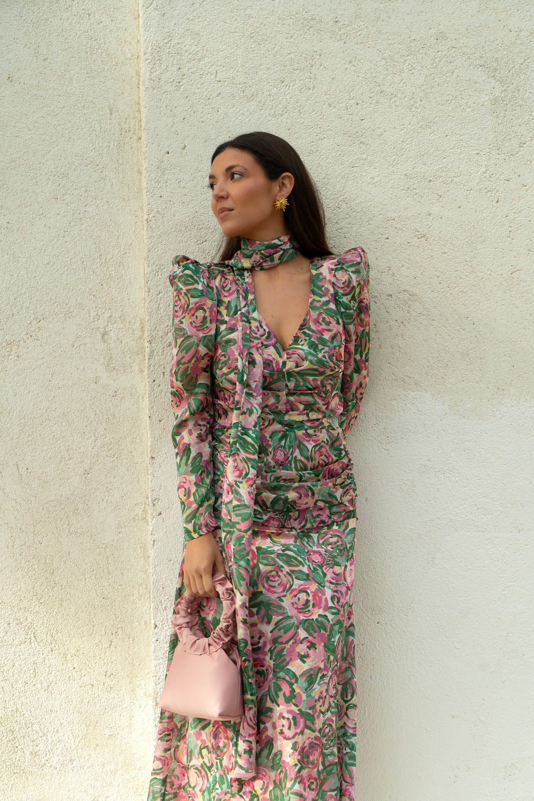 Midi dress with a V-neckline, long sleeves, high-shoulder coverage, gathered at the chest, and a bow at the neck. Floral print.