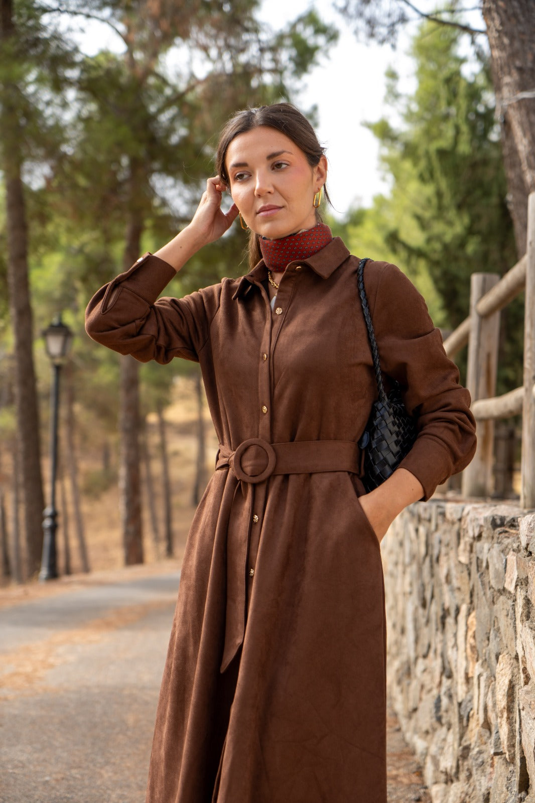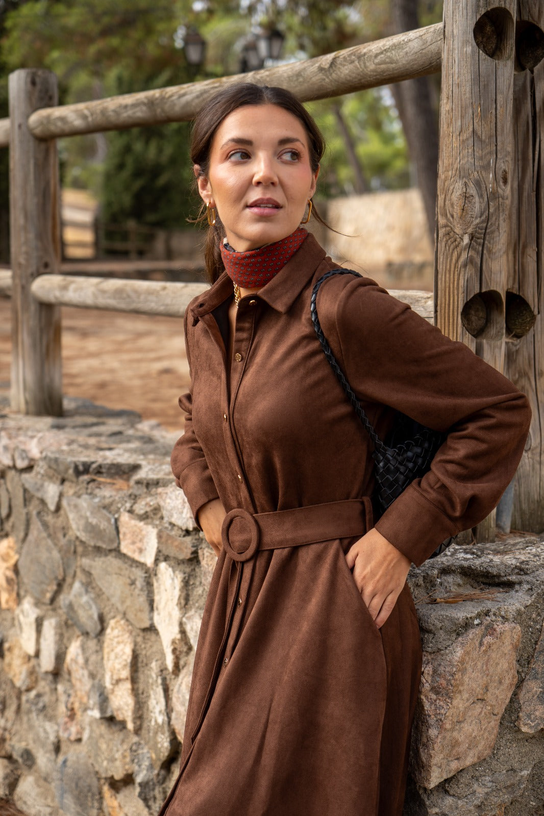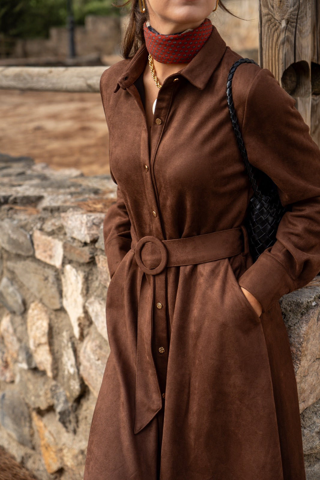 Brown suede dress, lapel collar, buttoned at the front, belt and side pockets.