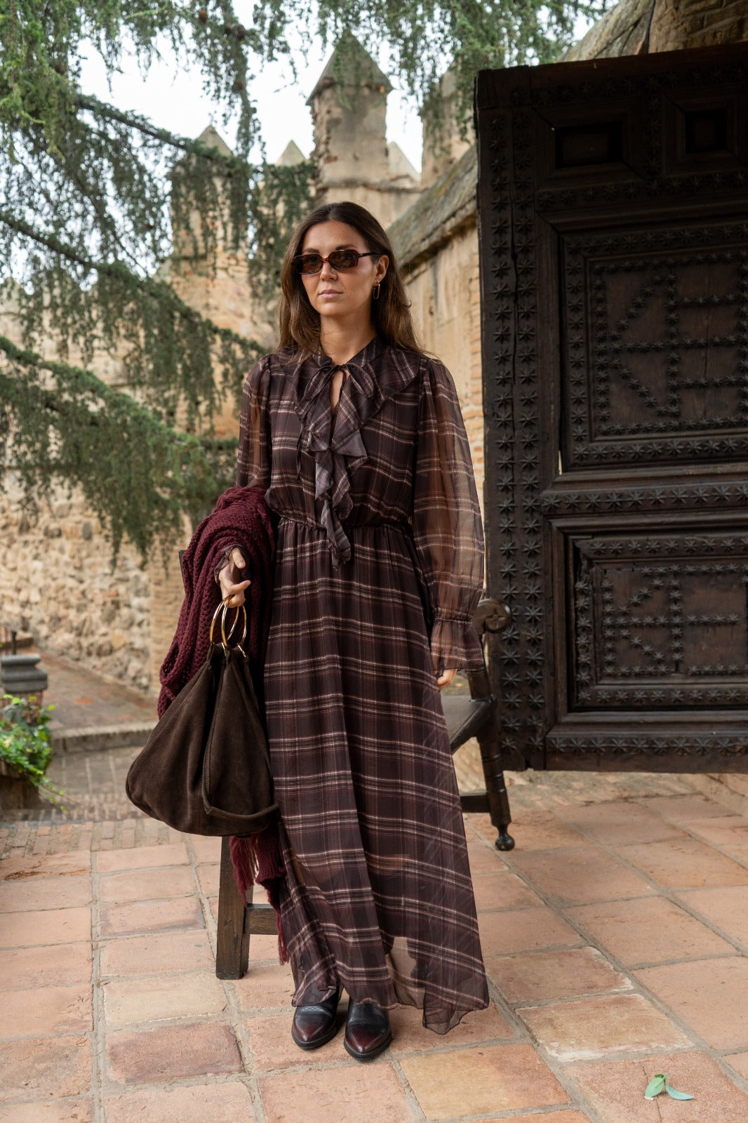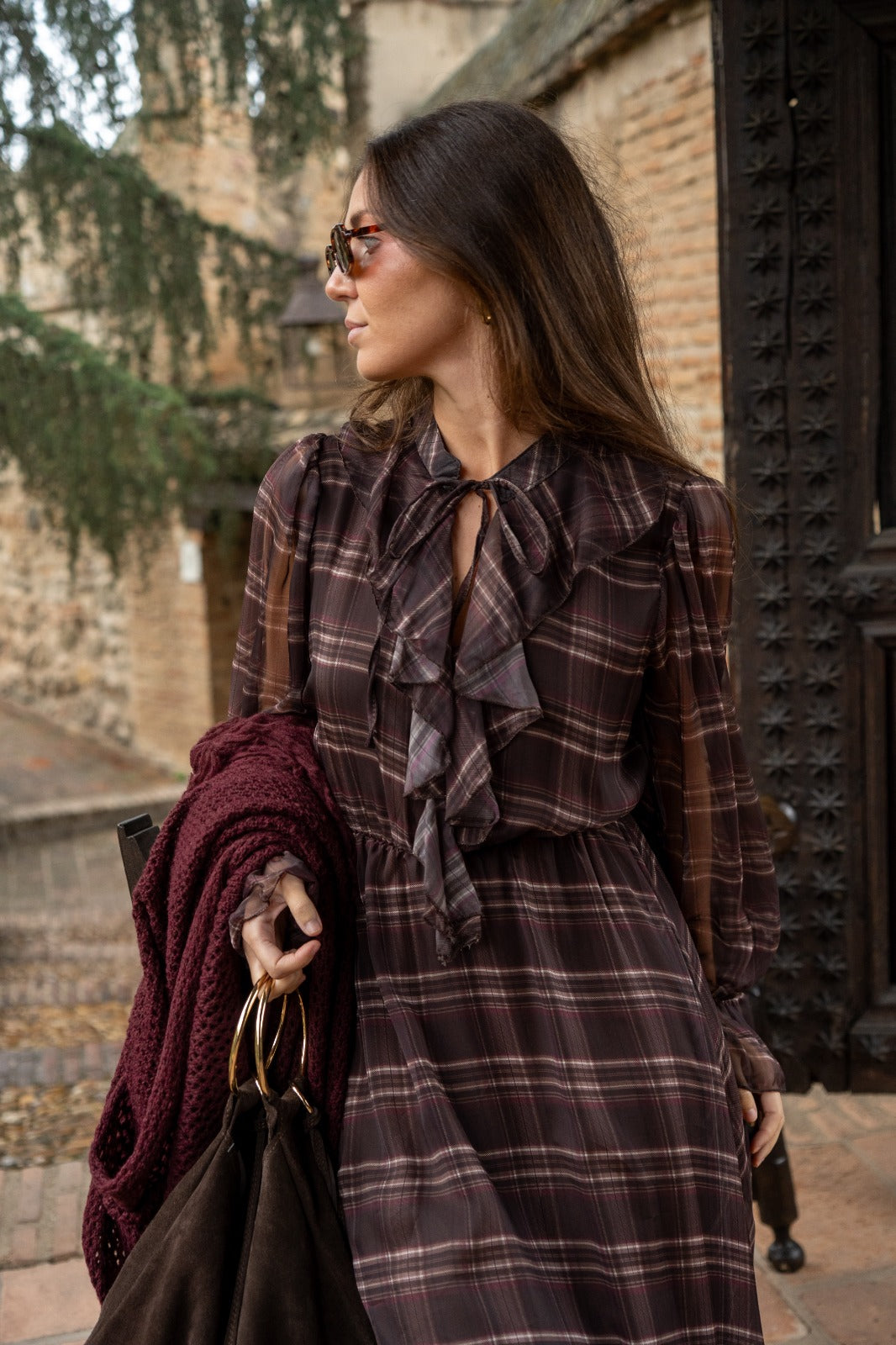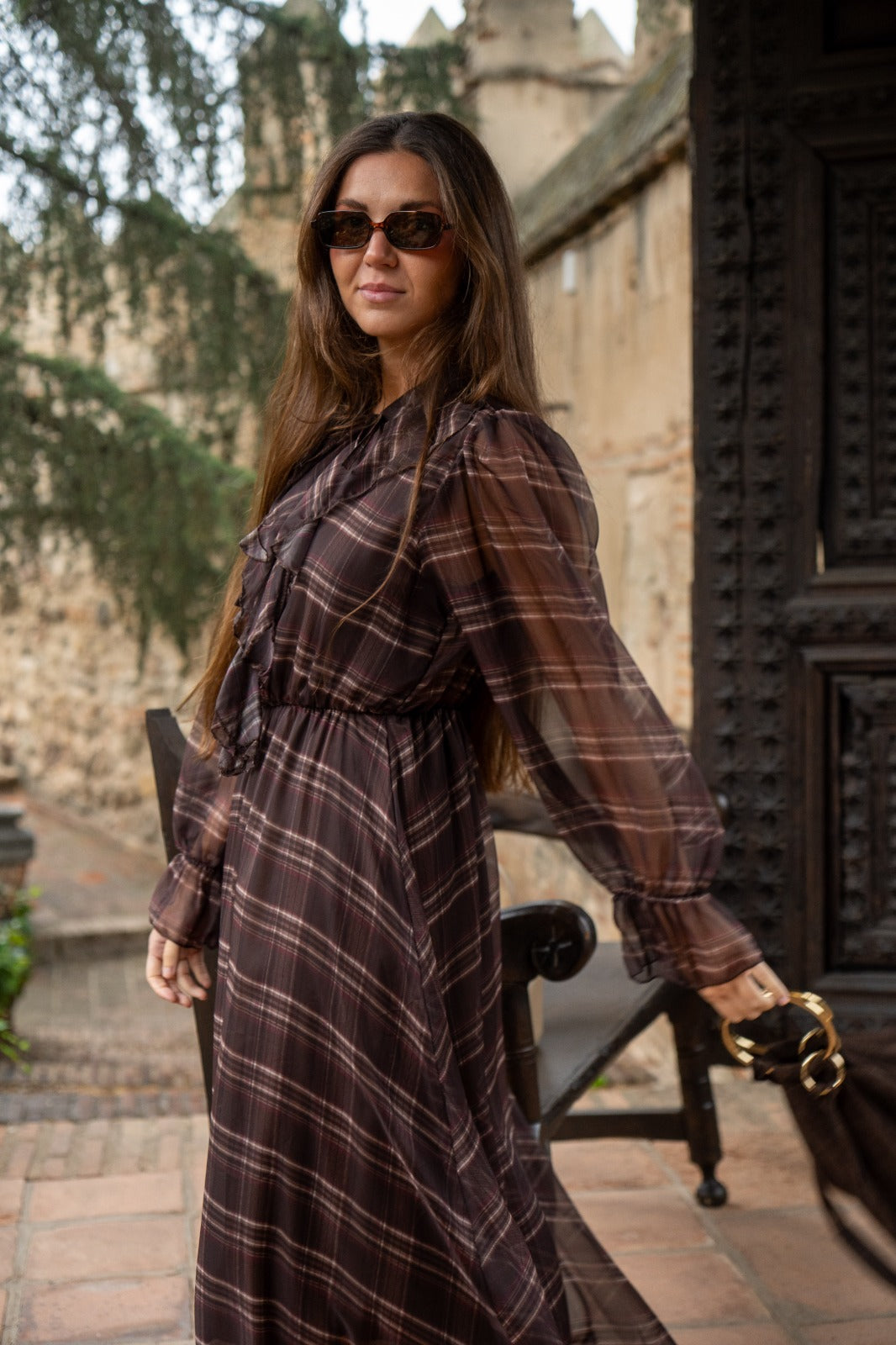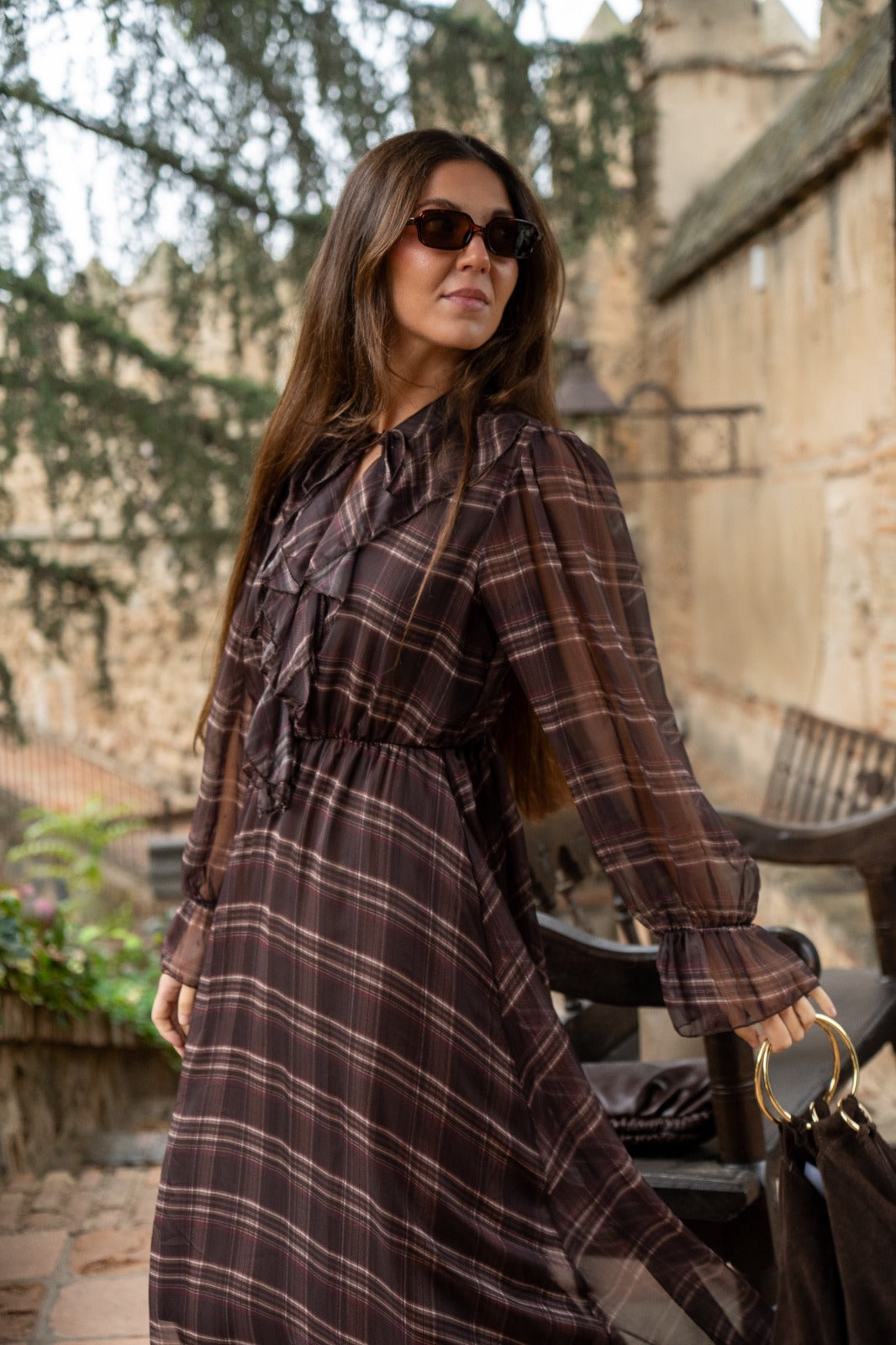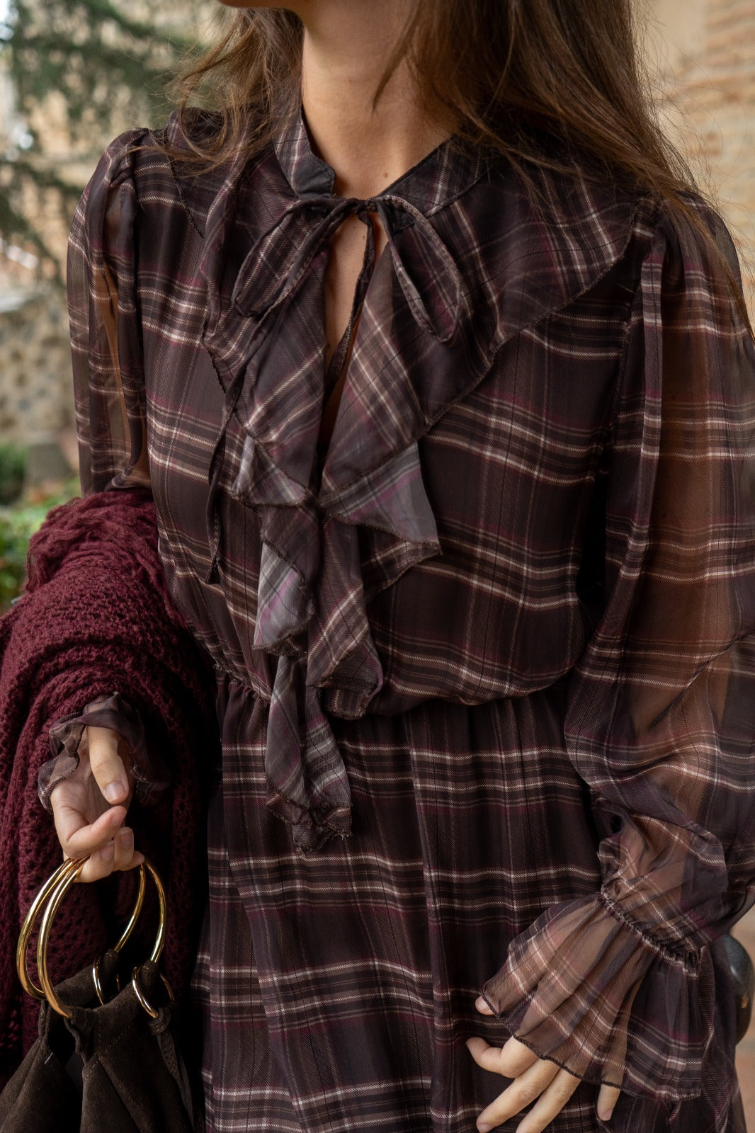 Midi dress, round neckline with tie, chiffon sleeves with elasticated cuffs, elasticated waist. In brown with a plaid print.