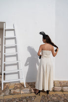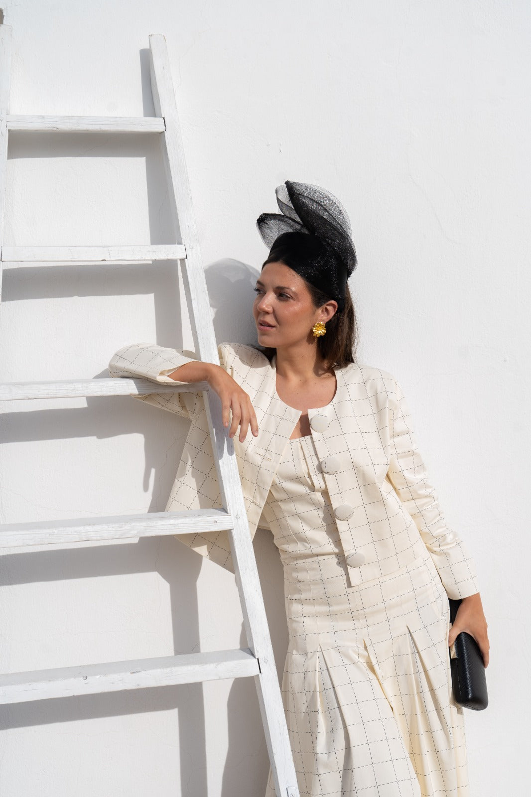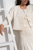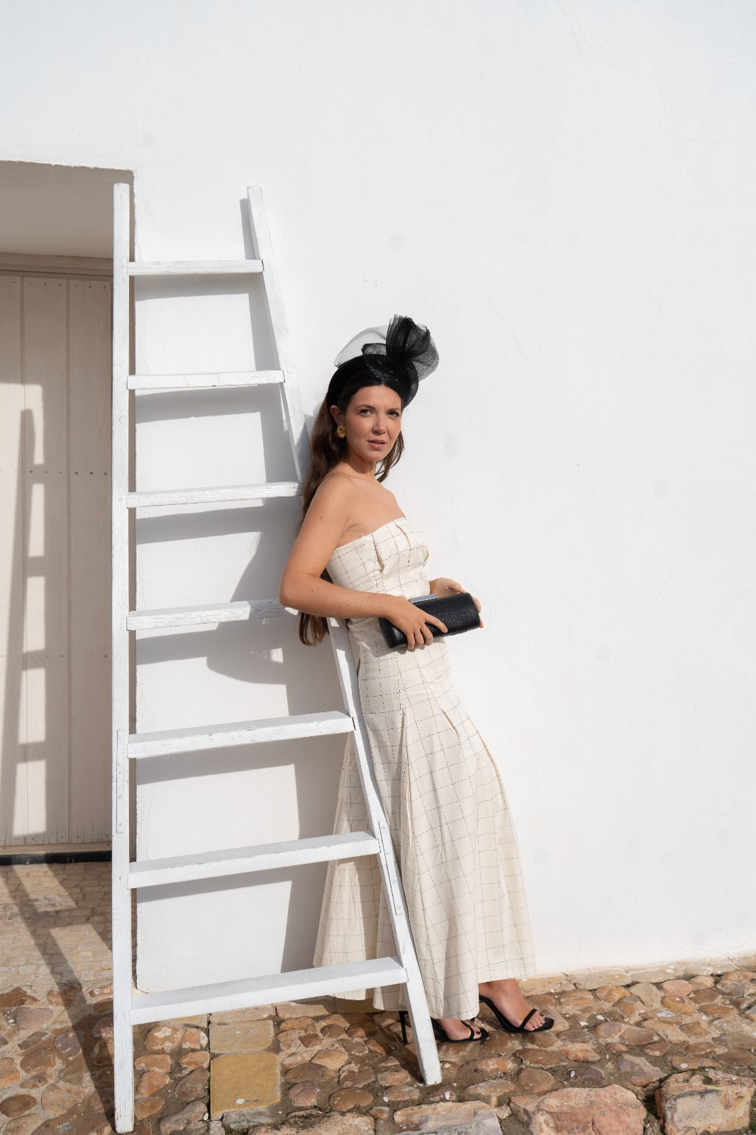 Strapless midi dress with a flared midi skirt and a straight-cut, long-sleeved jacket with front buttons. Beige with plaid details.
