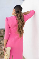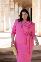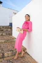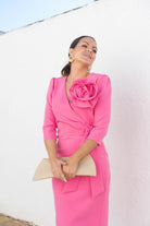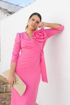 Midi dress with a crossover neckline, French sleeves, removable flower detail, side bow at the waist, and back slit. In pink.