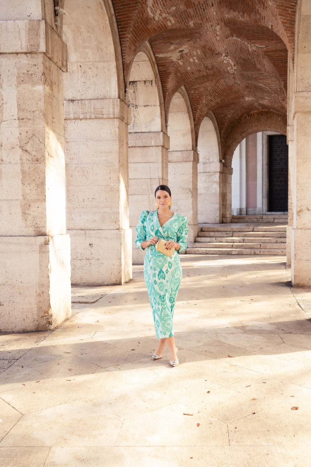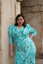 Midi dress with a wrap neckline, French sleeves, front gathering, and gold button detailing. Back slit. In green with a print.