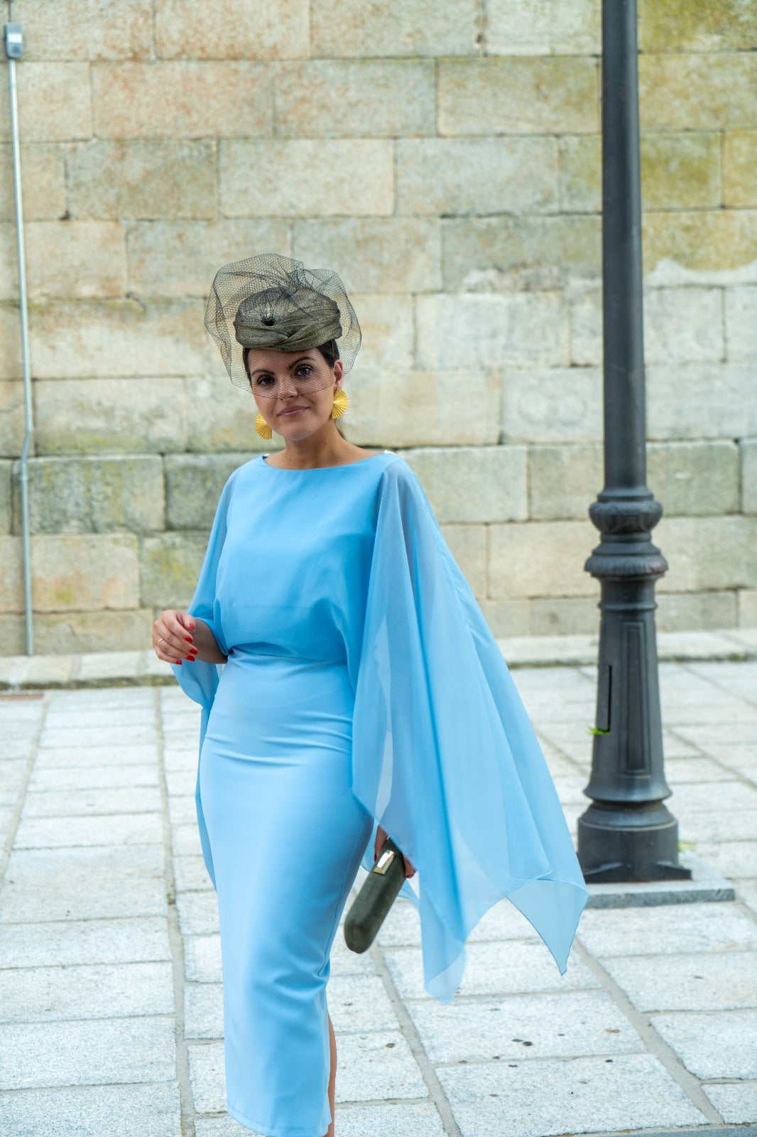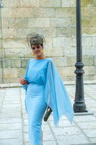 Midi dress with a round neckline, back neckline, sleeveless, chiffon overlay, waistline, straight skirt, back slit. In blue.