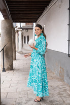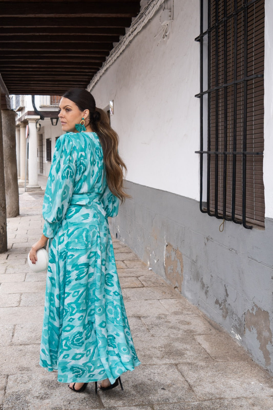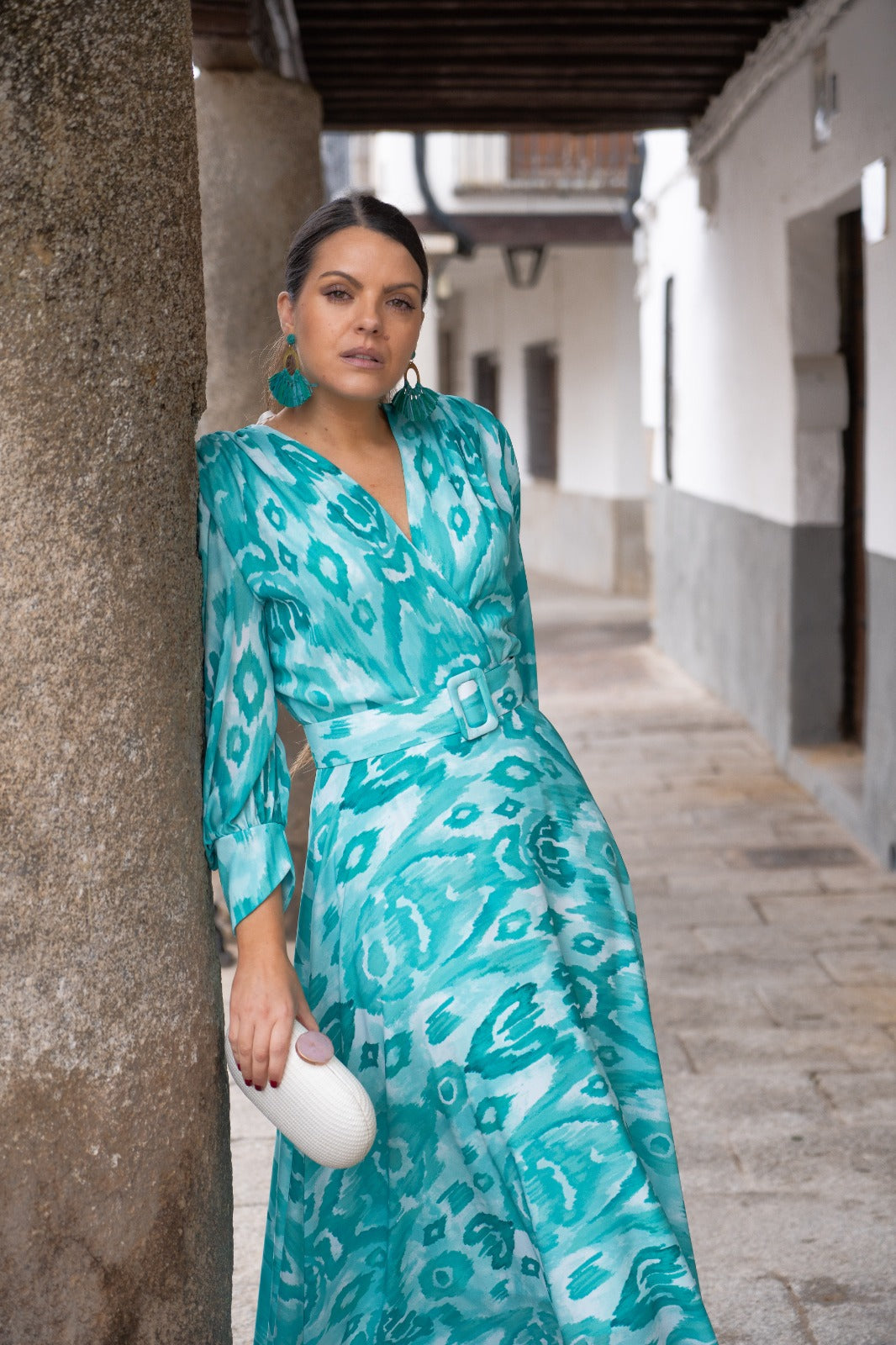 Wrap dress with a neckline, French sleeves with cuffs, a flared skirt that extends further in the back, and a belt included. Printed green.