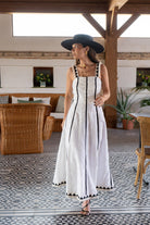 Midi dress with a square neckline, wide shoulder pads, flared at the bottom. White with black details.