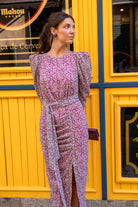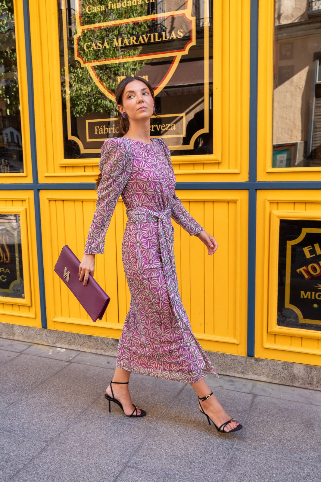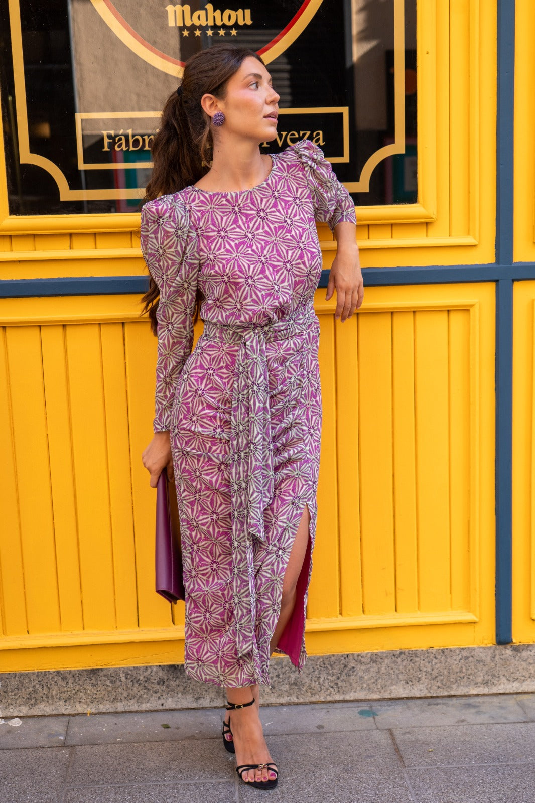 Chiffon dress with long sleeves, a round neck, a front slit with a gathered side slit, and a bow tie. In a purple print.