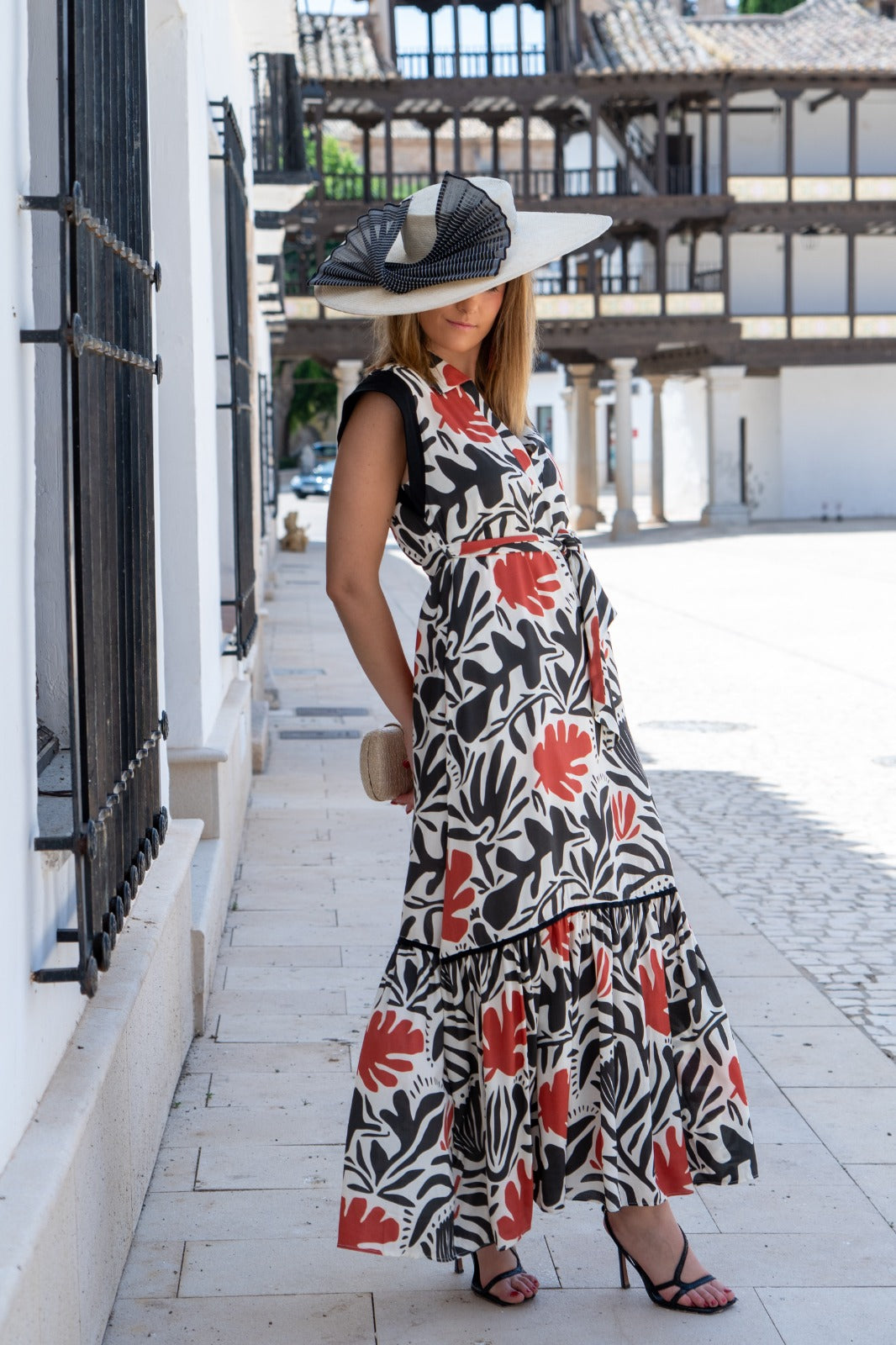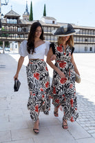 Long dress with a V-neck, sleeveless, belt included, and ruffle at the bottom. In a multi-colored print.