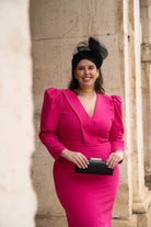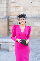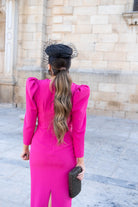Midi dress with a V-neckline and a lapel collar, puffed sleeves, and a back slit. In pink.