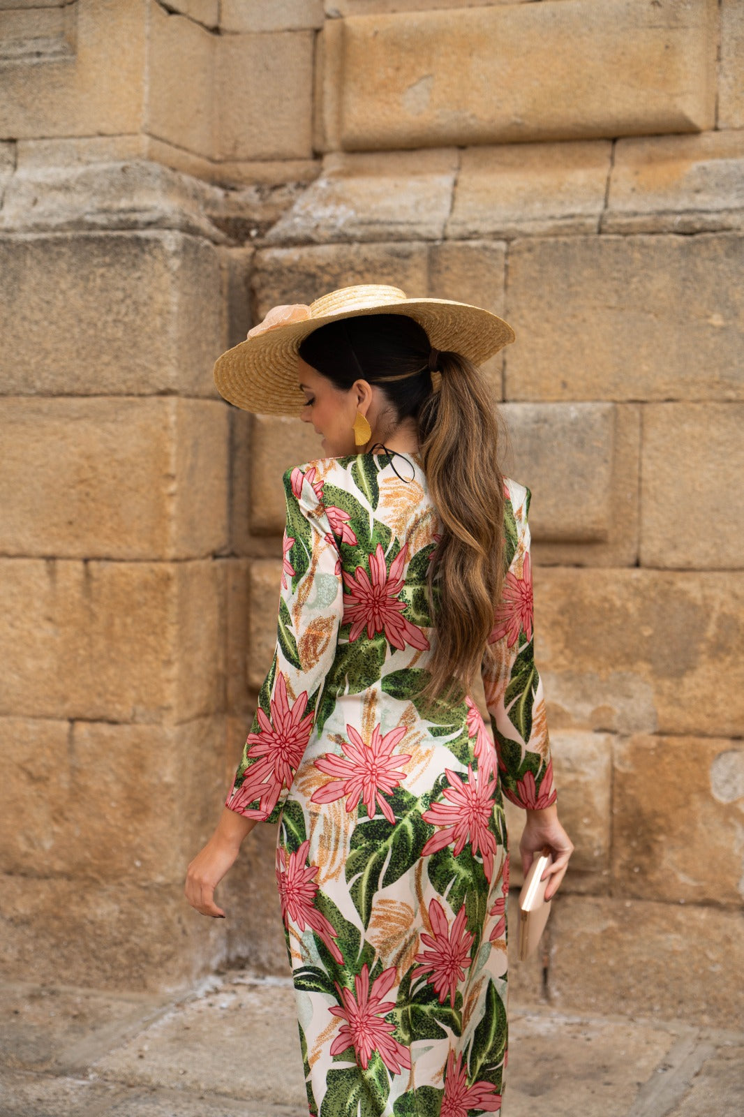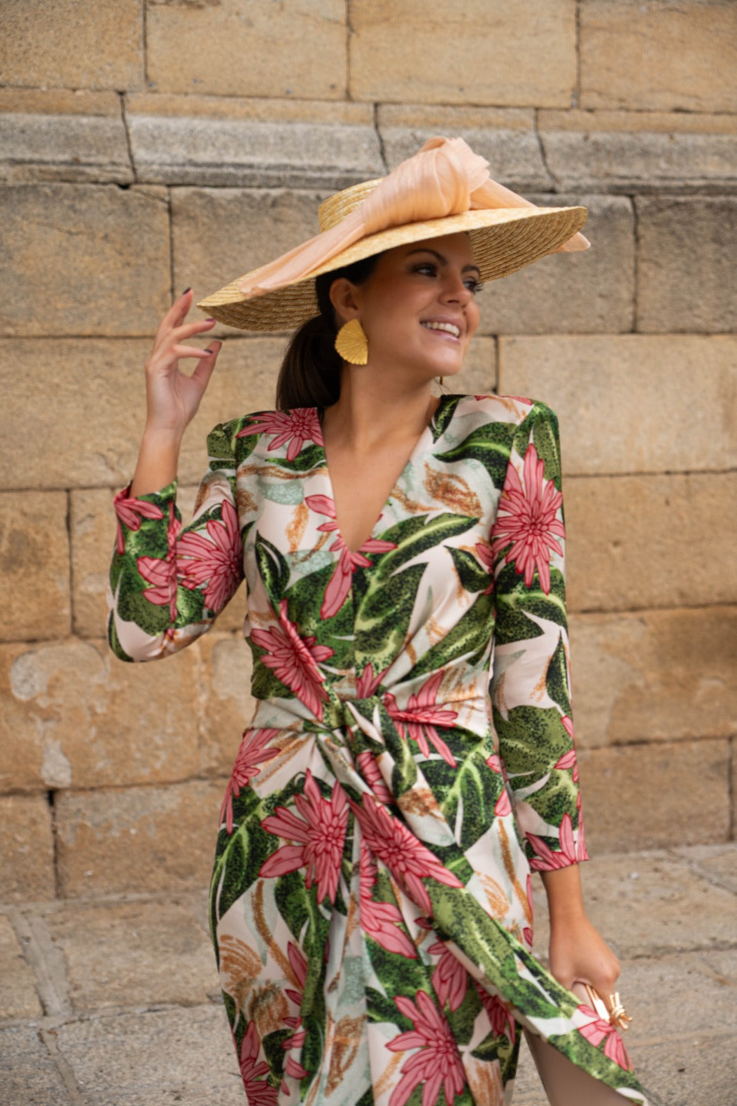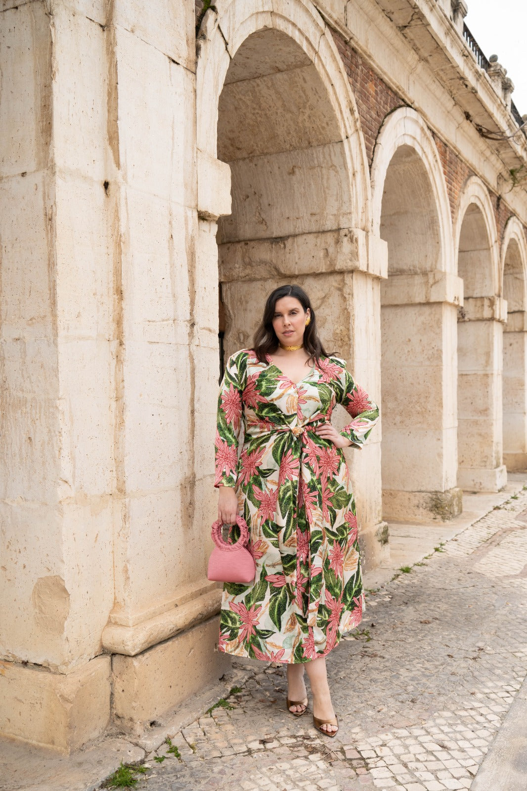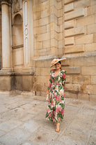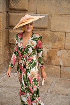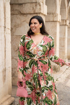 Flowing midi dress with a crossover neckline, French sleeves, and ties at the front. In beige with a green and pink floral print.