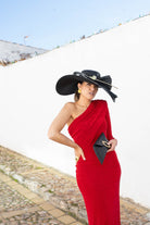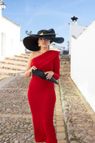 Asymmetrical midi dress with a draped cowl neckline that exposes one shoulder and wraps around the right arm, cut at the waist with a straight skirt. In burgundy knit.