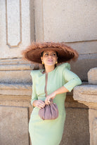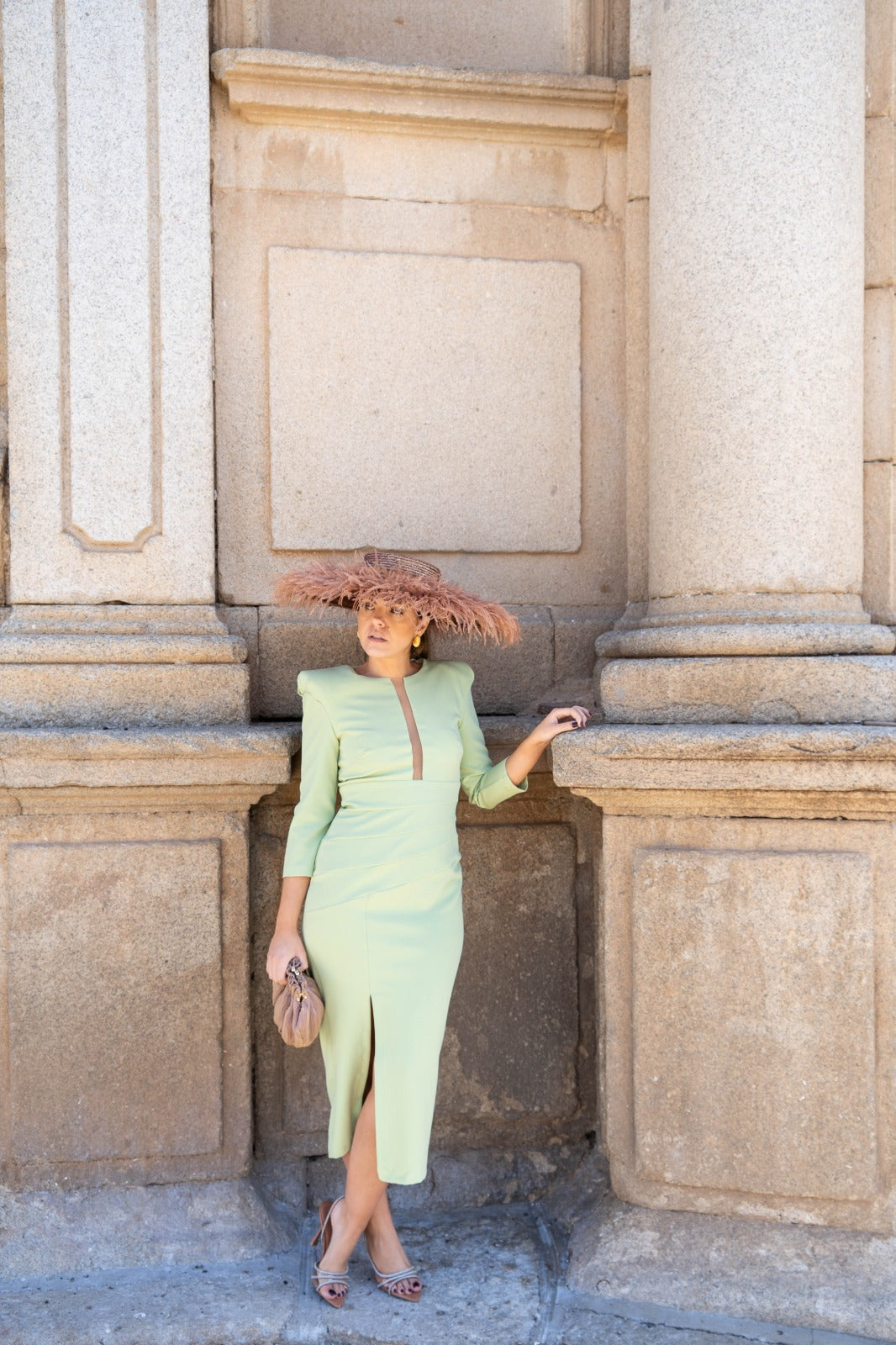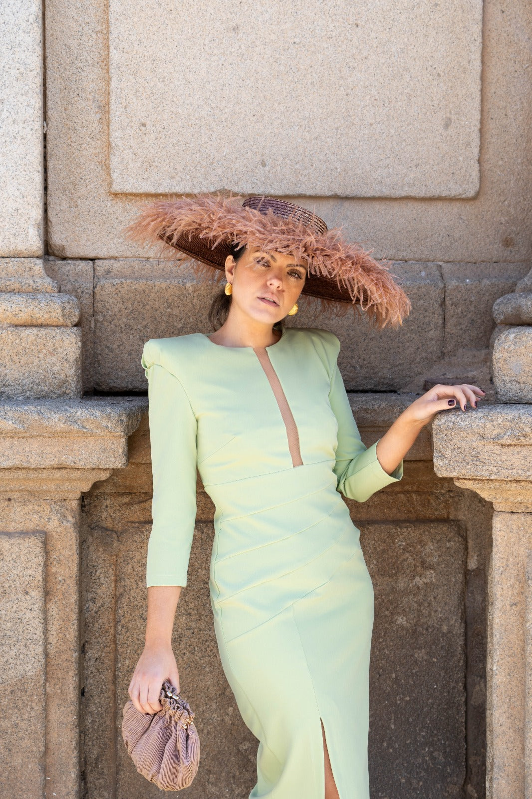 Midi dress, round neckline with transparent strap, French puffed sleeves on the shoulder, front opening on one side. In green.