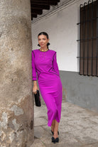 Midi dress with a round neckline, French sleeves, and back slit. In pink with black details.