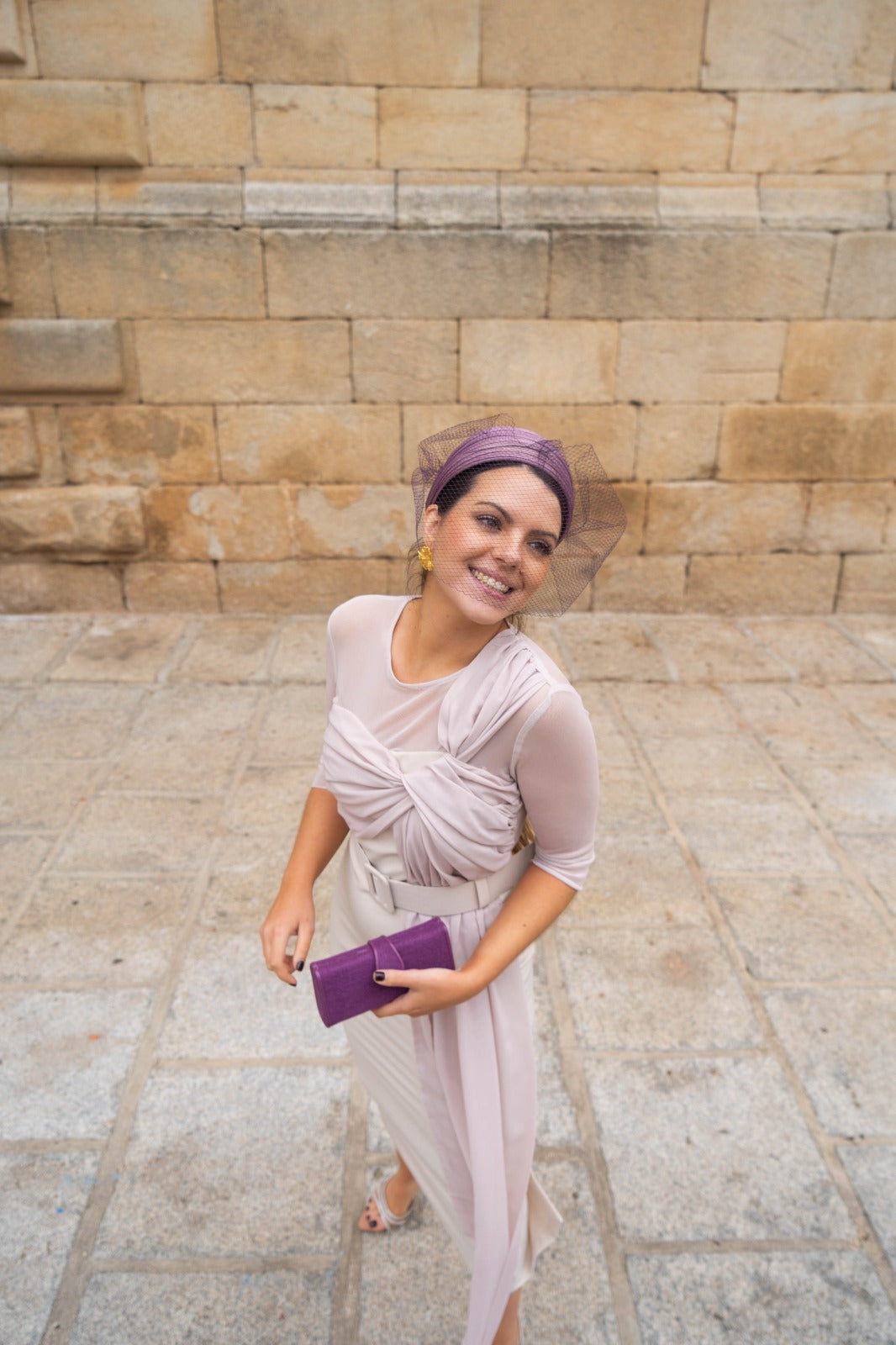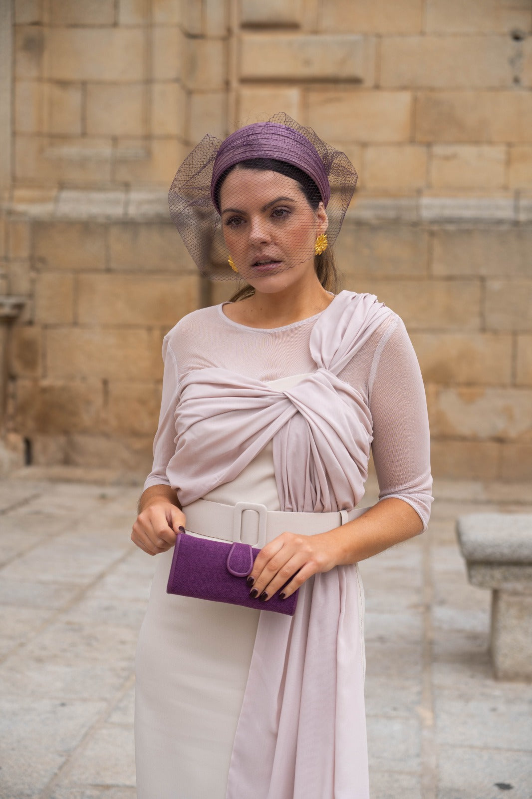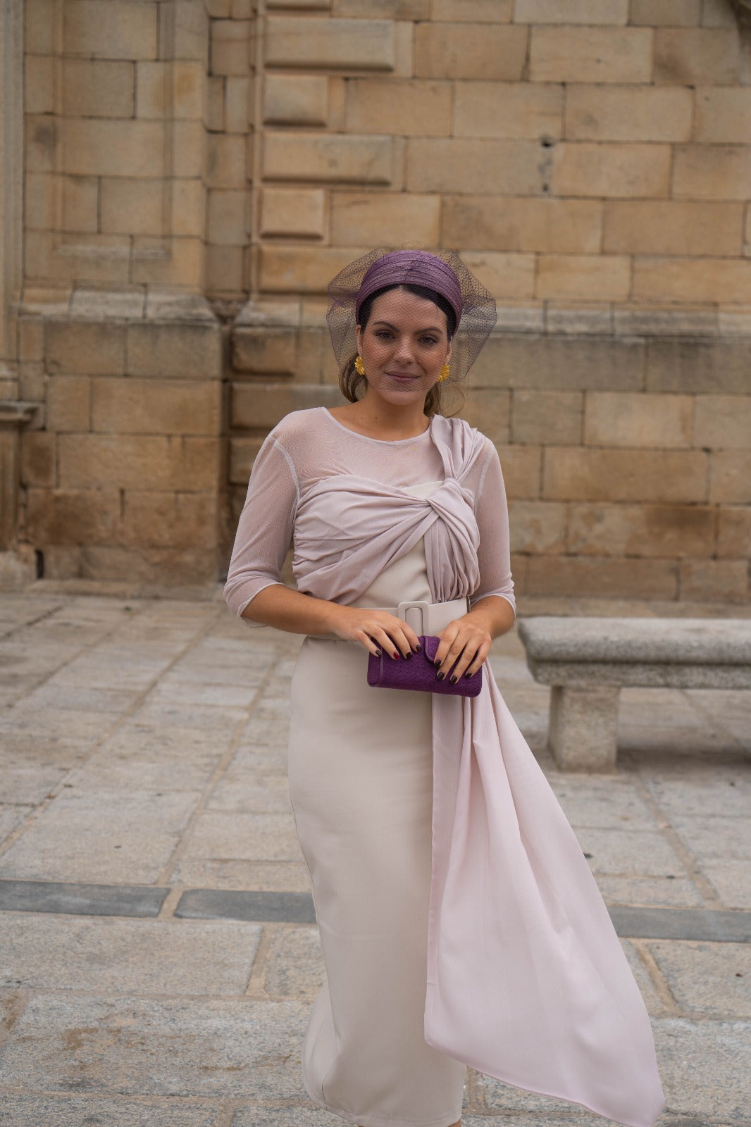 Midi dress with a round neckline, French sleeves, chiffon top with a long bow on one side, belt included, and back slit. In beige.