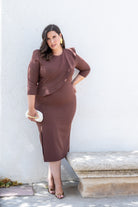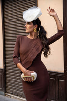Midi dress, round neckline, long sleeves, ruffle on one side of the chest, front slit. In brown.