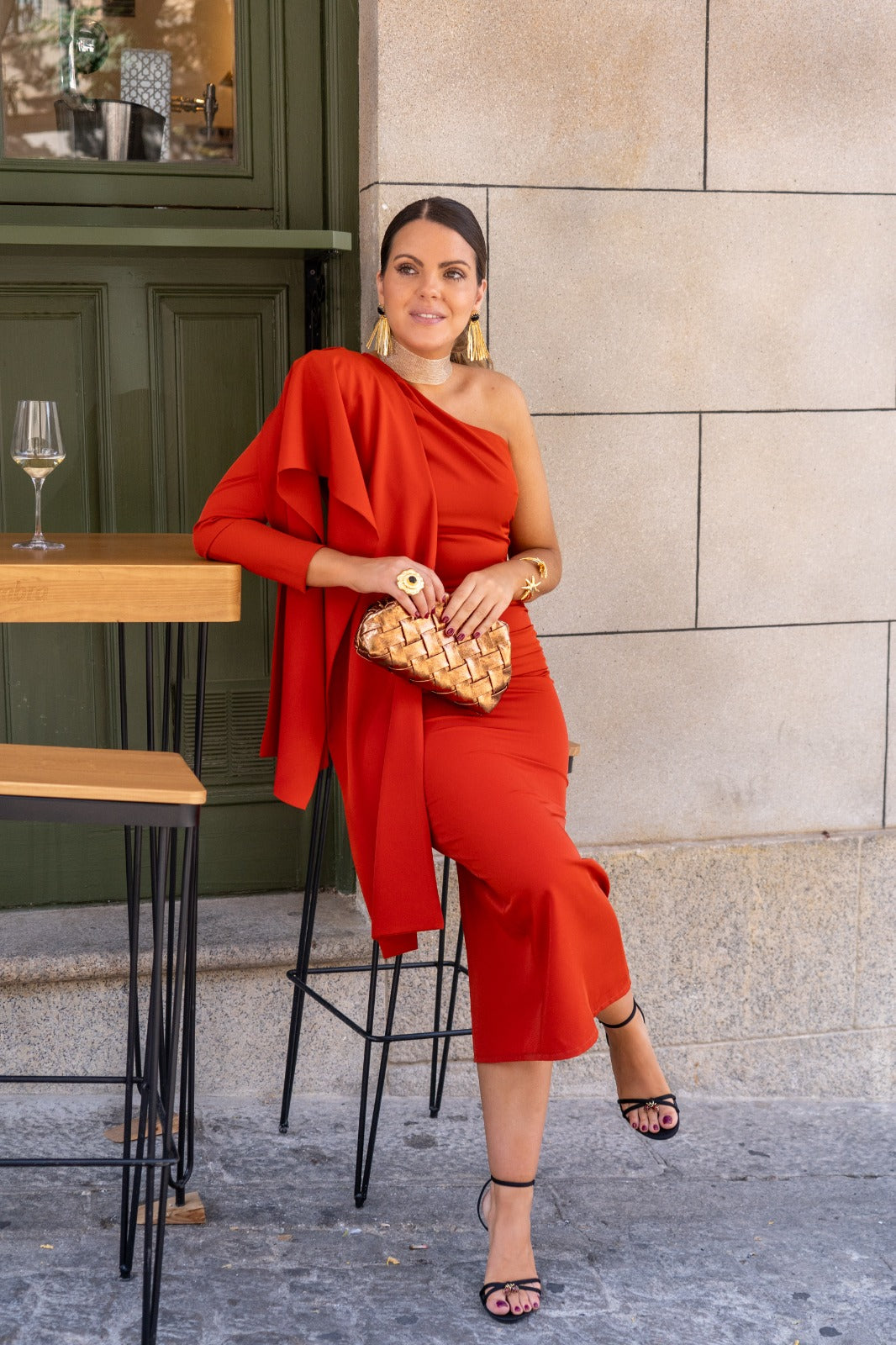 Asymmetrical midi dress with long sleeves on one side and a bow at the waist. Gathered at the waist and slit in the back. Available in a boiler-colored top.