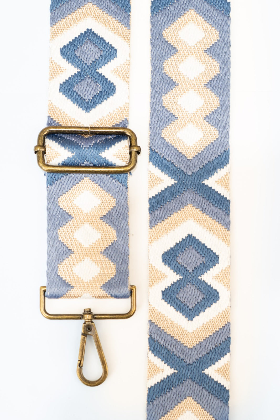 Woven ethnic crossbody strap with various blue and beige prints. Matches the Cies and Cotal bags.