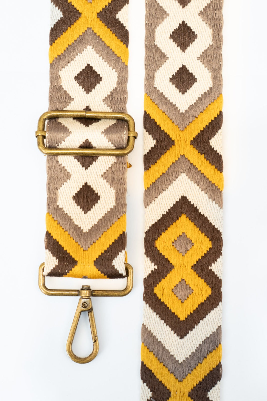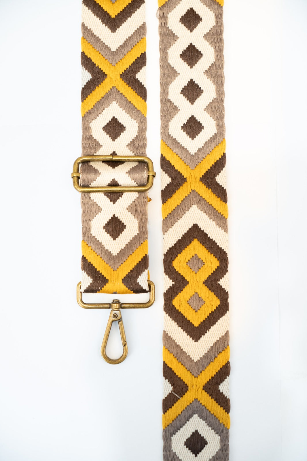 Woven ethnic crossbody strap with various prints in mustard and brown. Matches the Cies and Cotal bags.