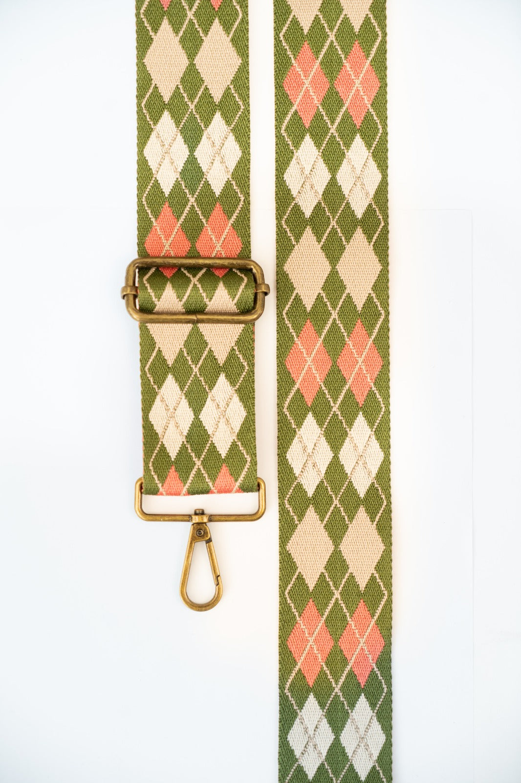 Woven ethnic crossbody strap with various green and pink prints. Matches the Cies and Cotal bags.