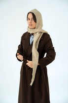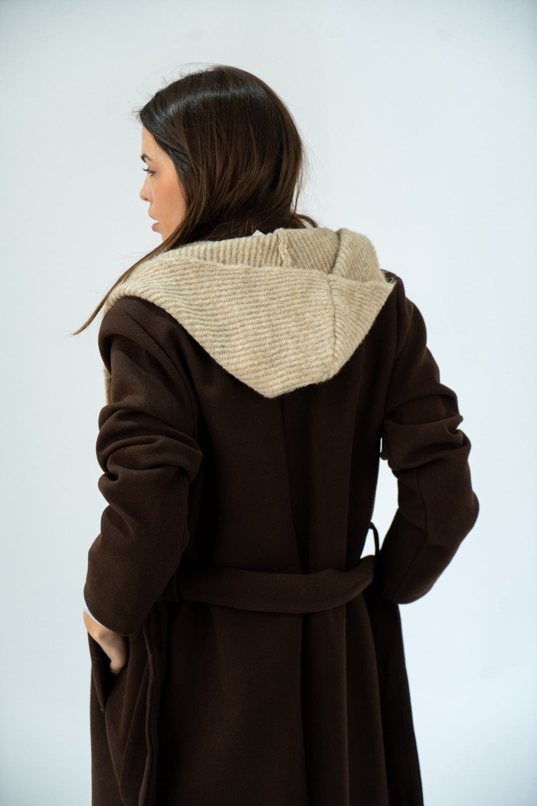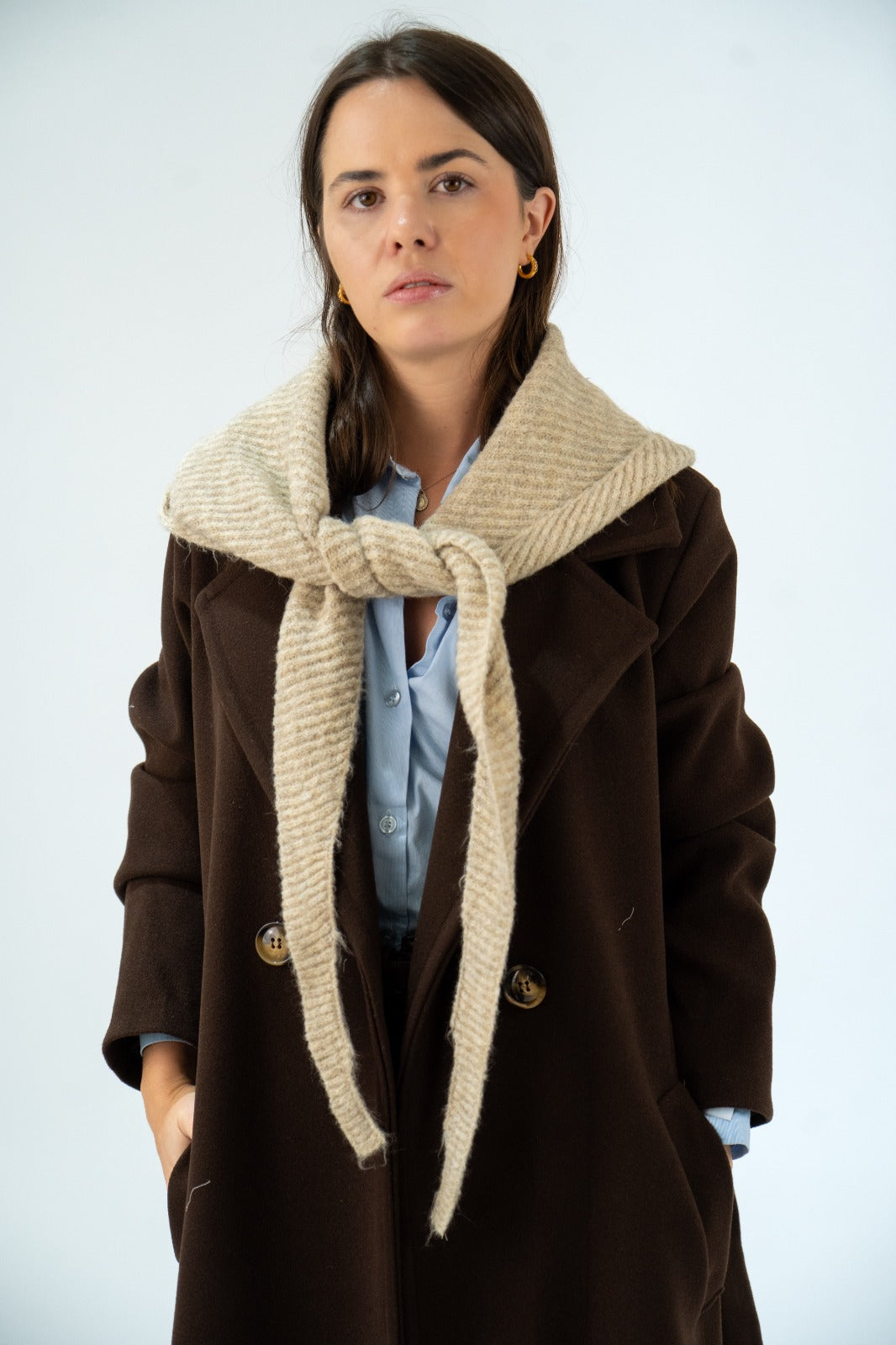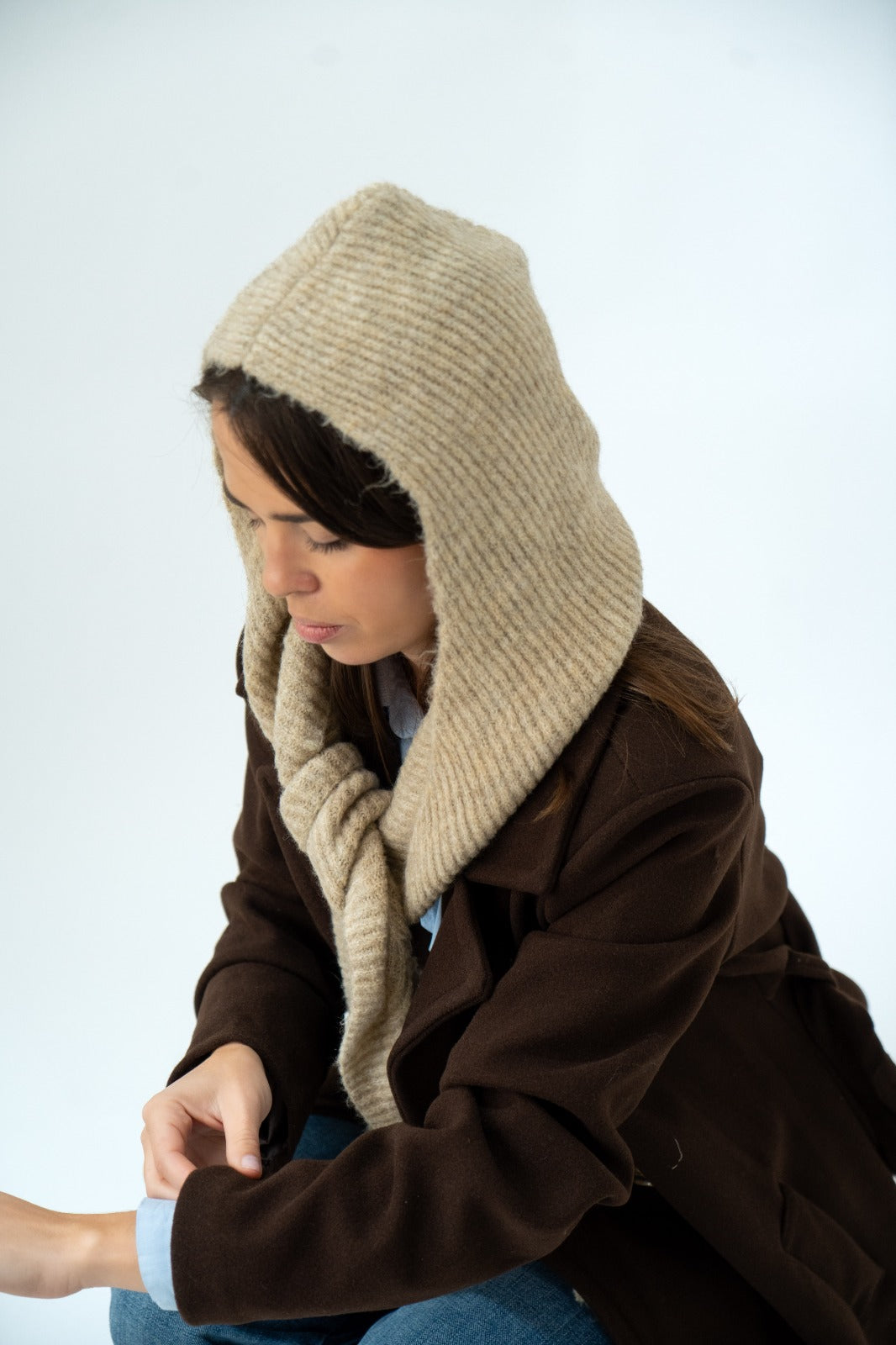 Combination of a scarf with pointed ends and a wool hood, in beige.
