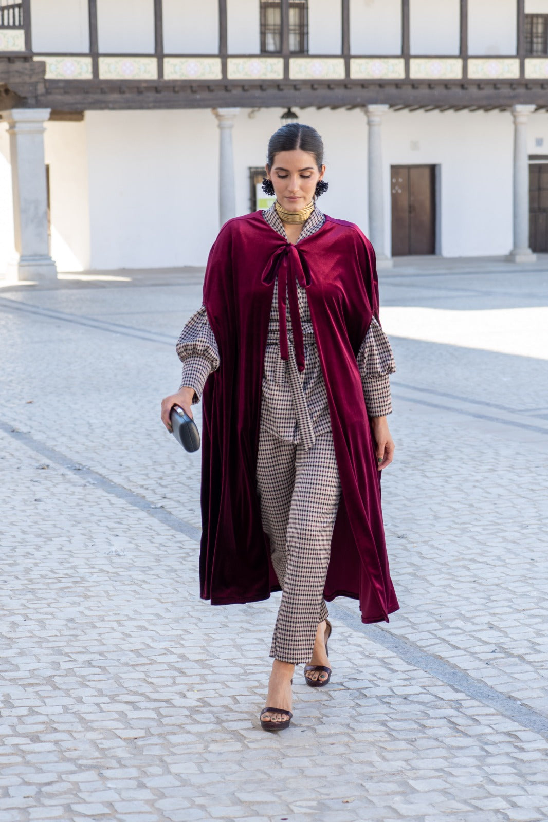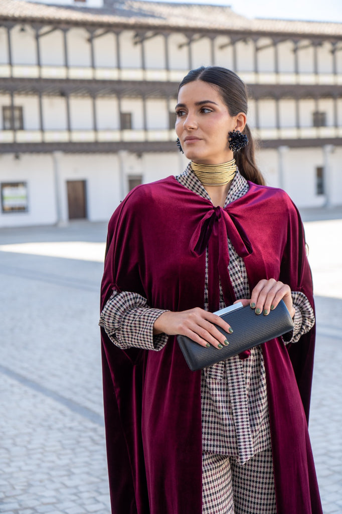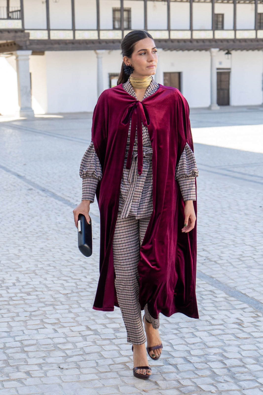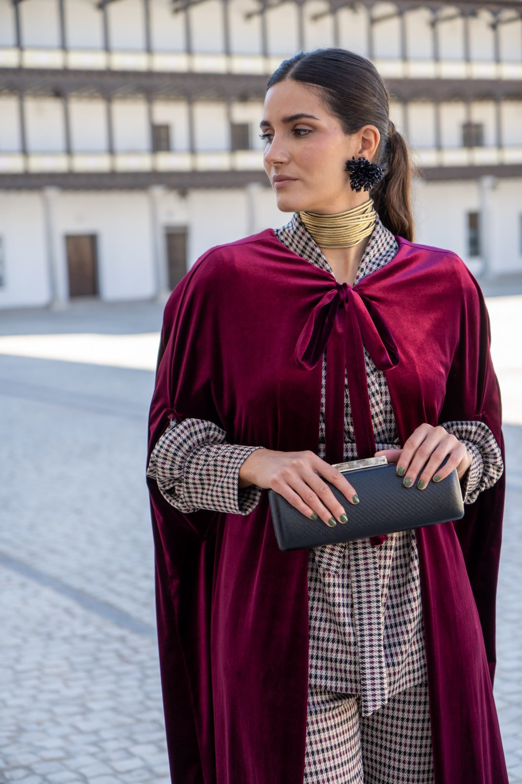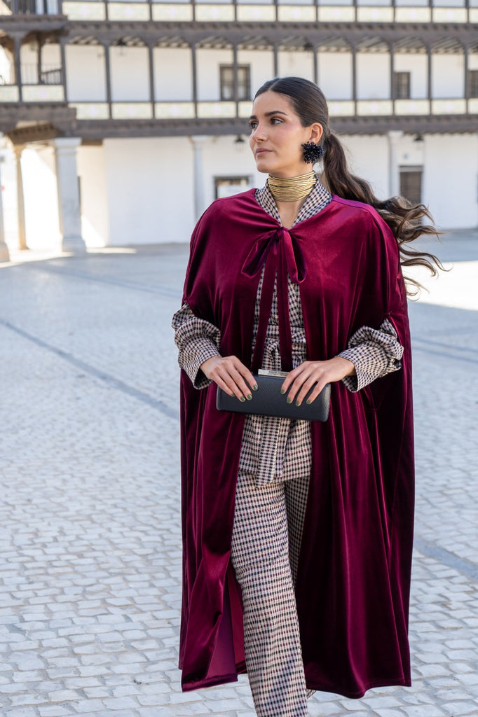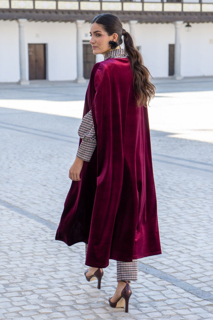 Velvet cape, with openings for the hands, approximately 120cm long, with a tie to fasten at the neck. In burgundy.
