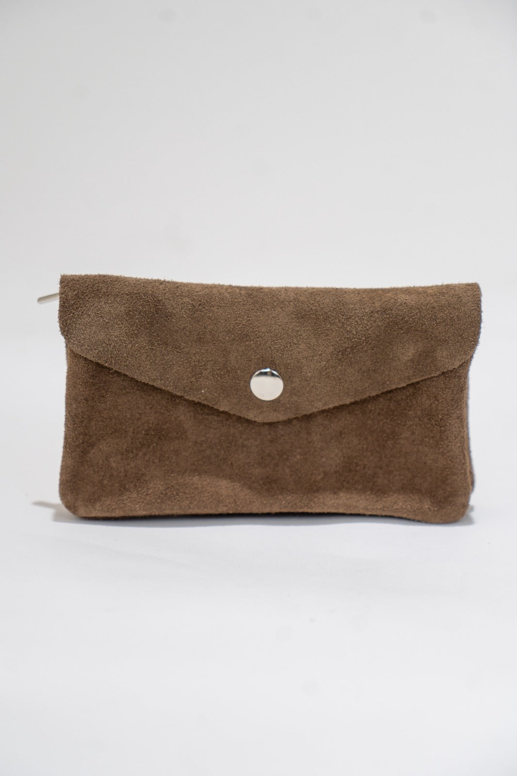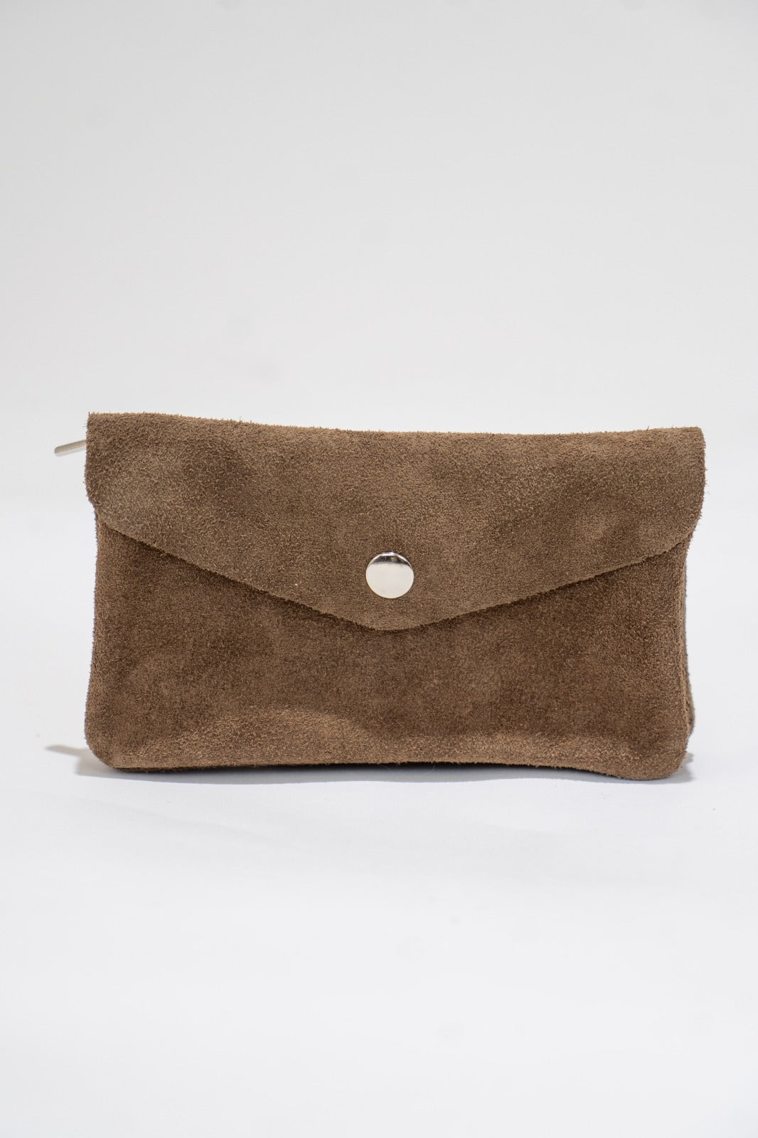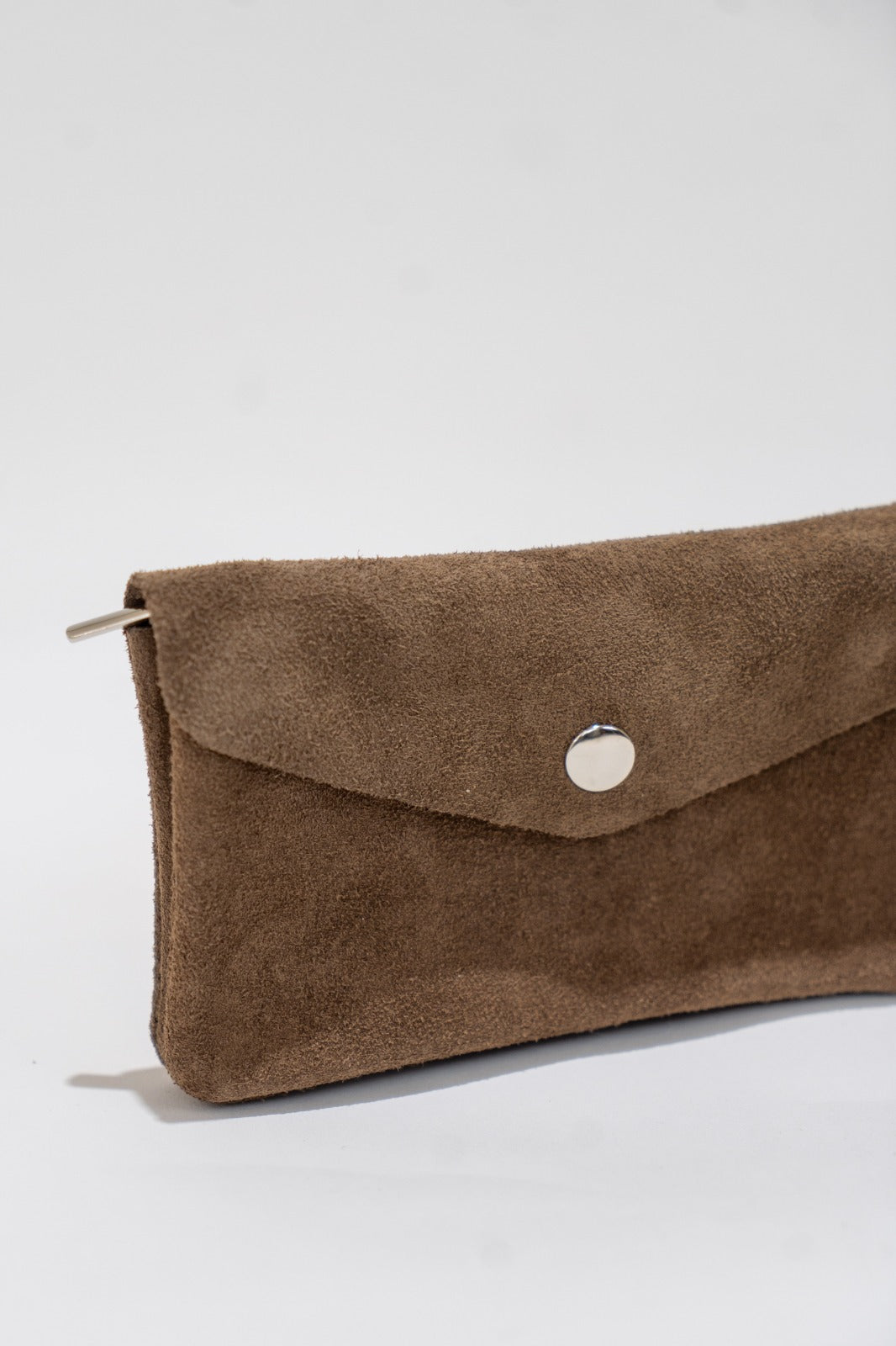 Cartera ante, cremallera y varios departamentos interior, cierre con automático, en color marrón.