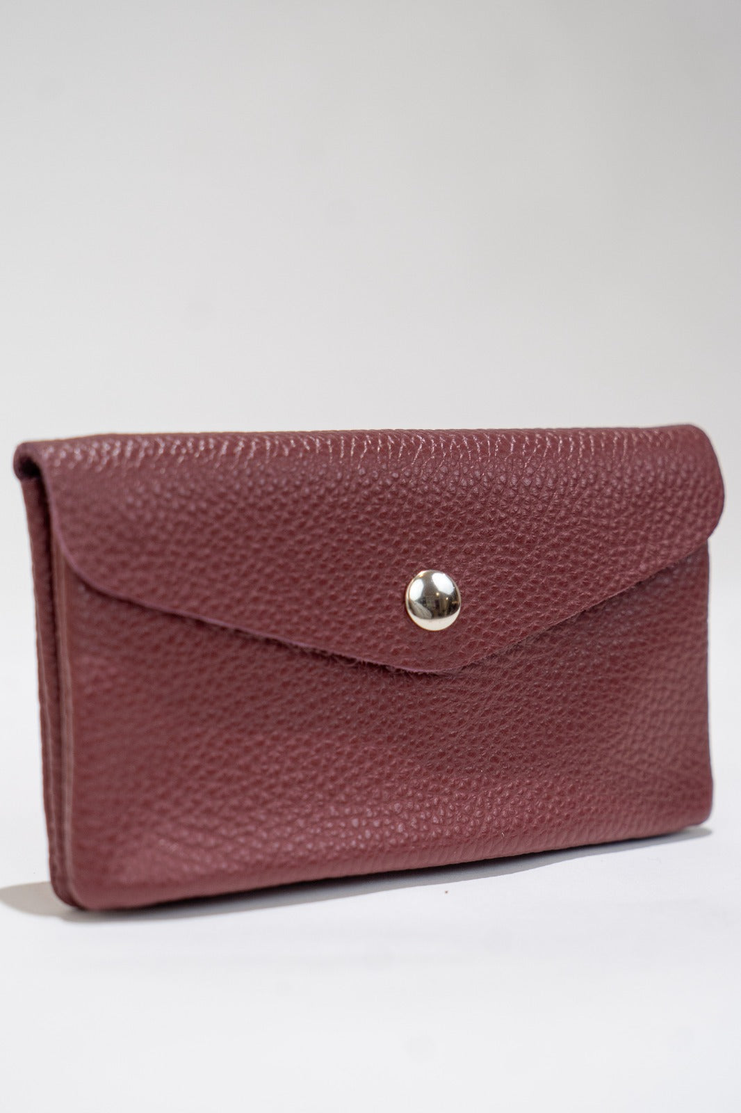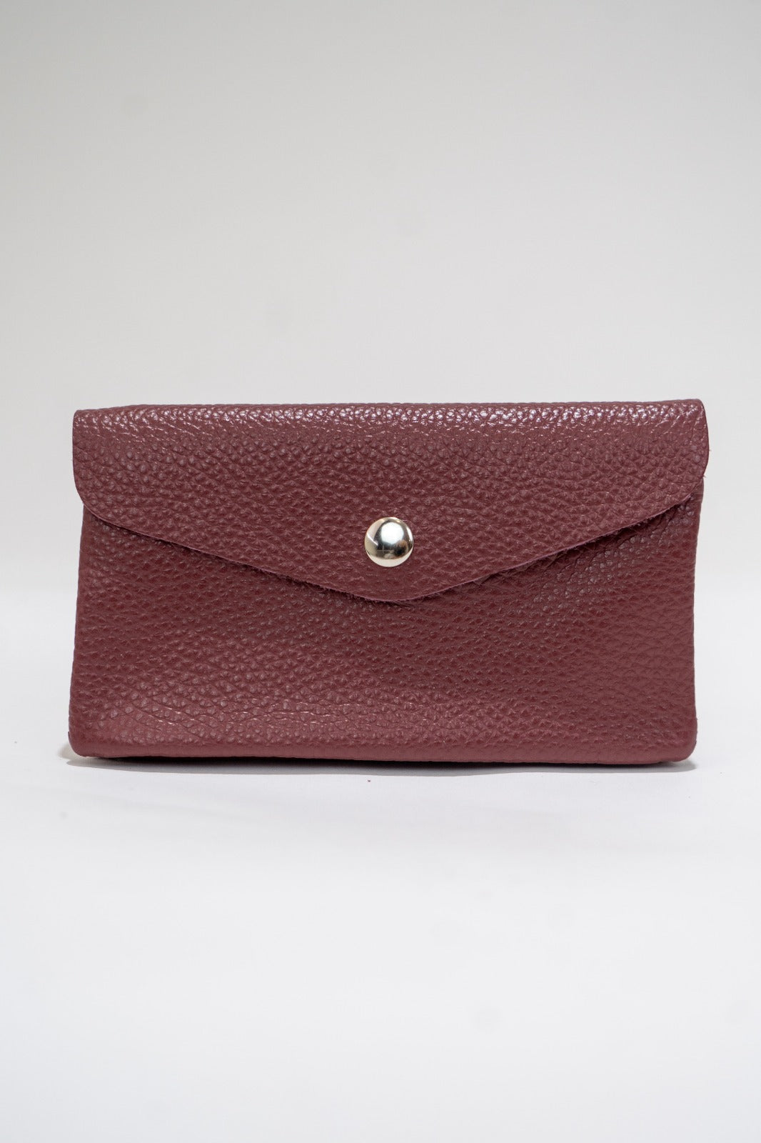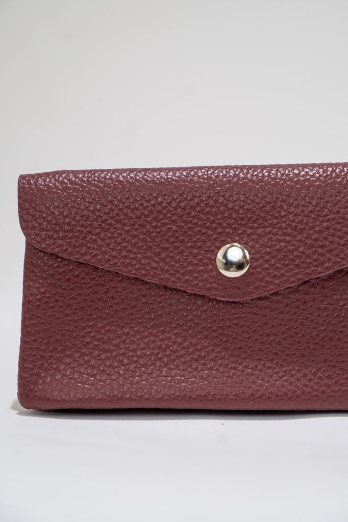 Cartera poli piel, cremallera y varios departamentos interior, cierre con automático, en color burdeos.