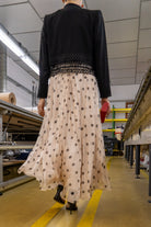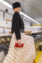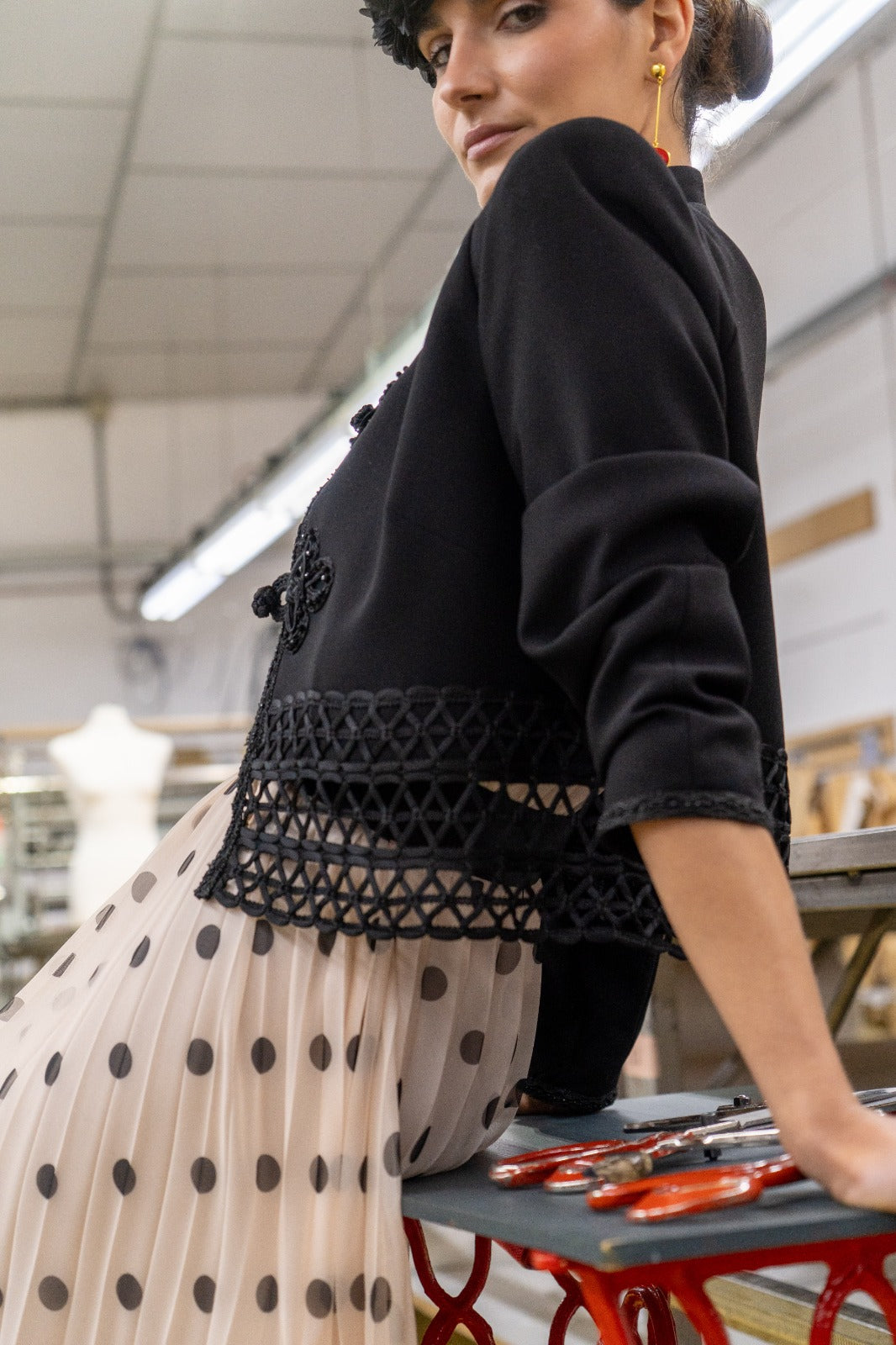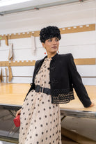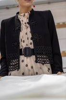Short black jacket with toggle closure detail, mandarin collar, long sleeves, and guipure hem. In black.