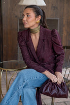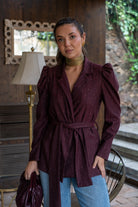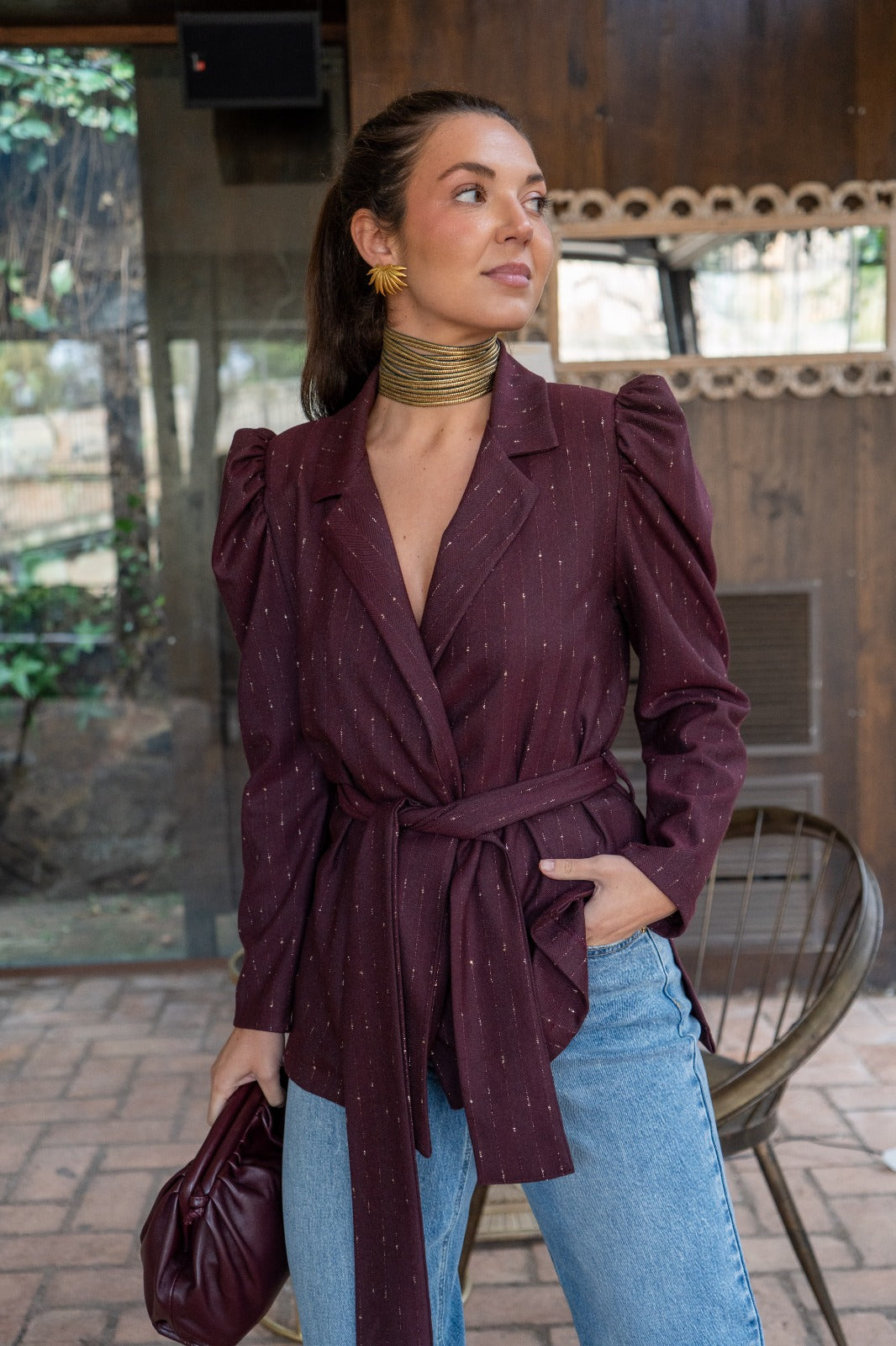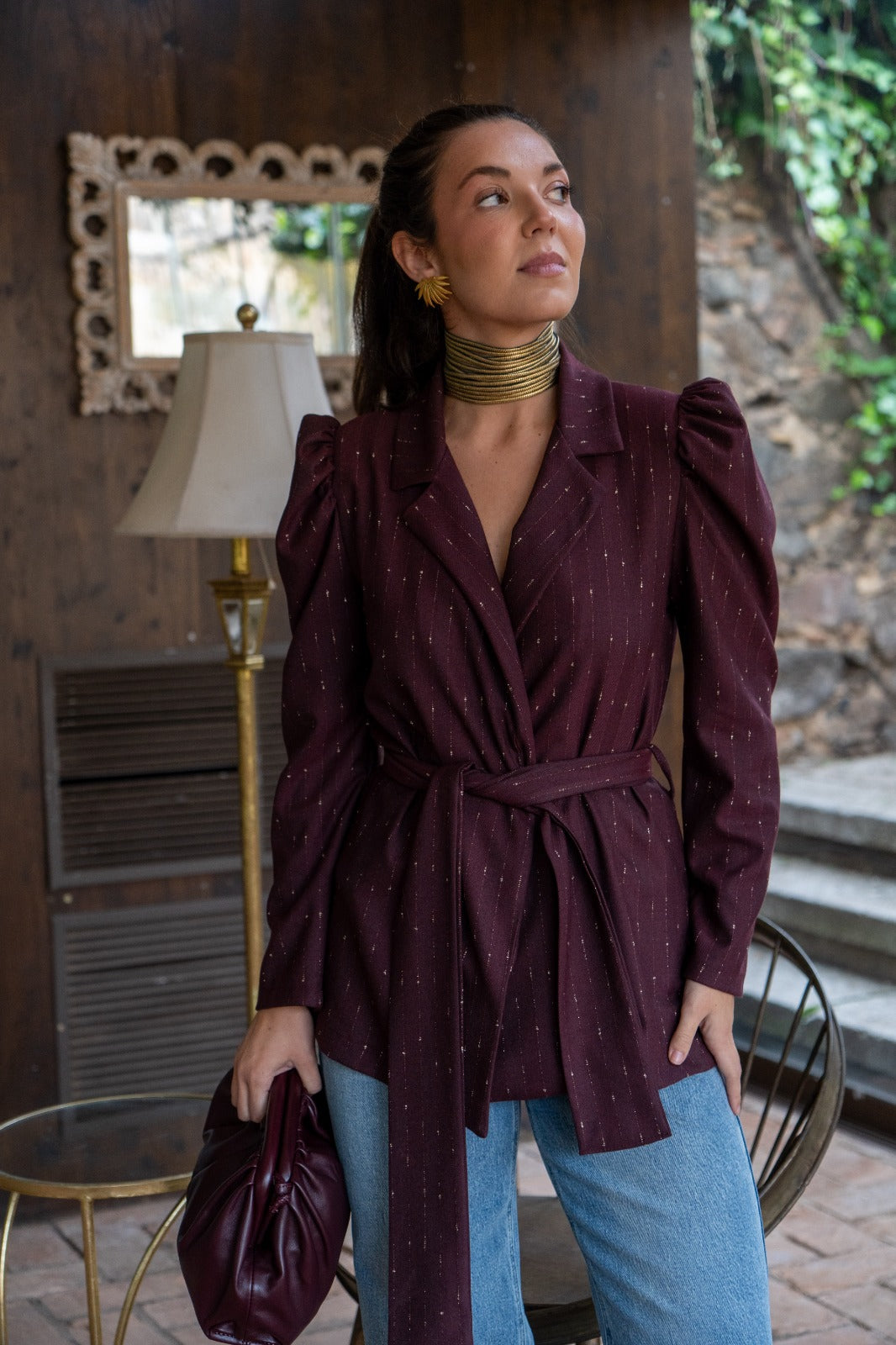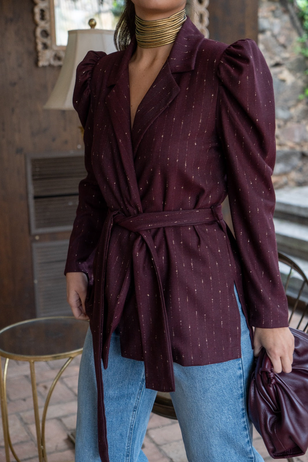 Tuxedo collar jacket, long puffed sleeves at the shoulder, belted closure, in burgundy with gold lurex,