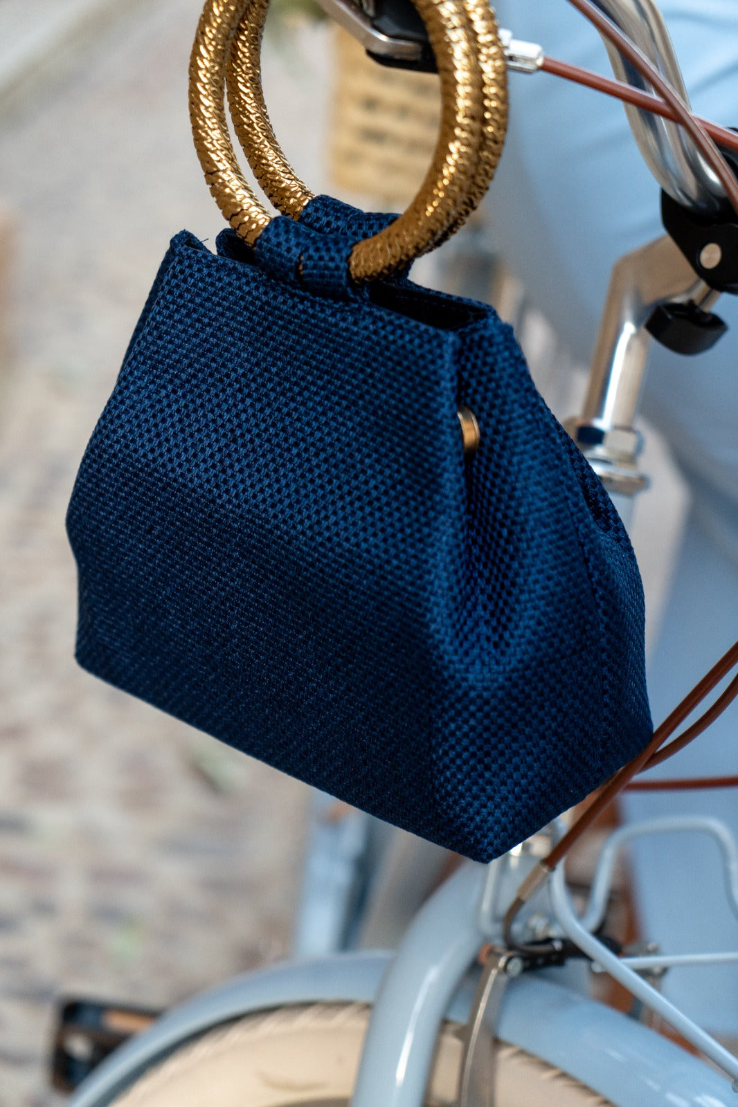 Bolso en tejido, cierre con iman, asas redondas doradas, cadena dorada para colgar. En color azul.