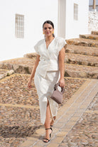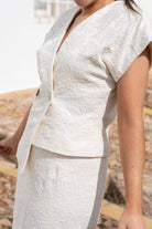Set featuring a short-sleeved top with shoulder pads, a crossover V-neckline fastened with a pair of mother-of-pearl buttons at the waist, a small peplum, and a straight, midi-length skirt with a central slit. Made in a rustic beige jacquard print.