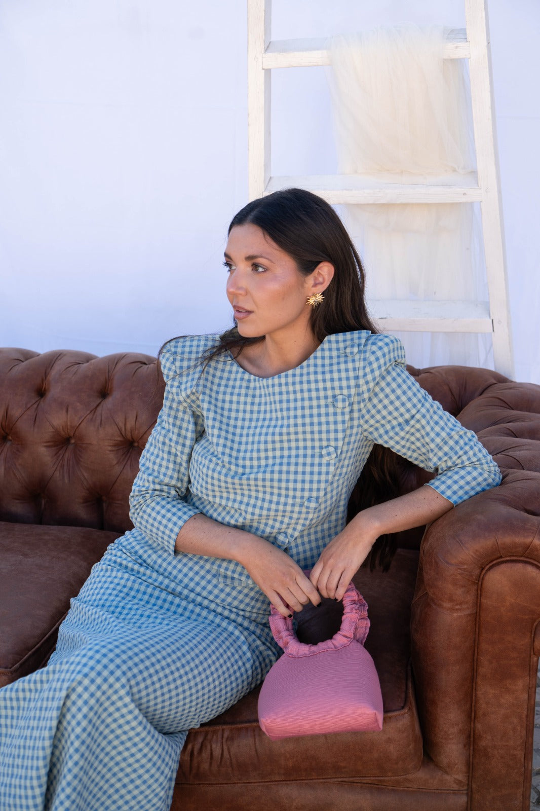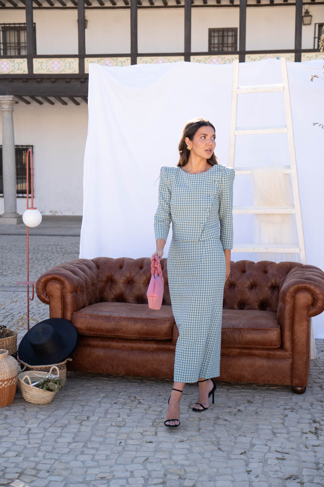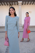 Set featuring a round-neck, button-up, wraparound blouse and high-waisted skirt with a back slit. In blue and green gingham.