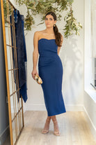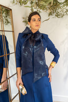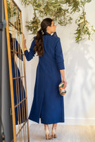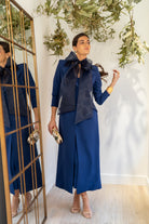 Set consisting of a strapless dress with a back slit and a tuxedo-collar coat with an organza bow and three-quarter sleeves. In blue.