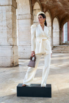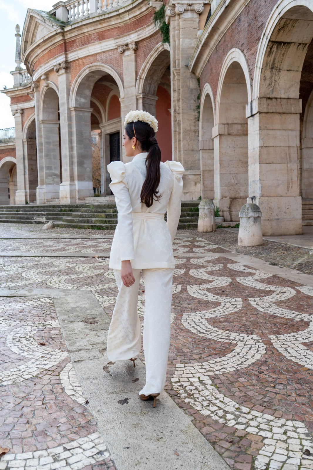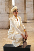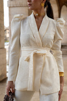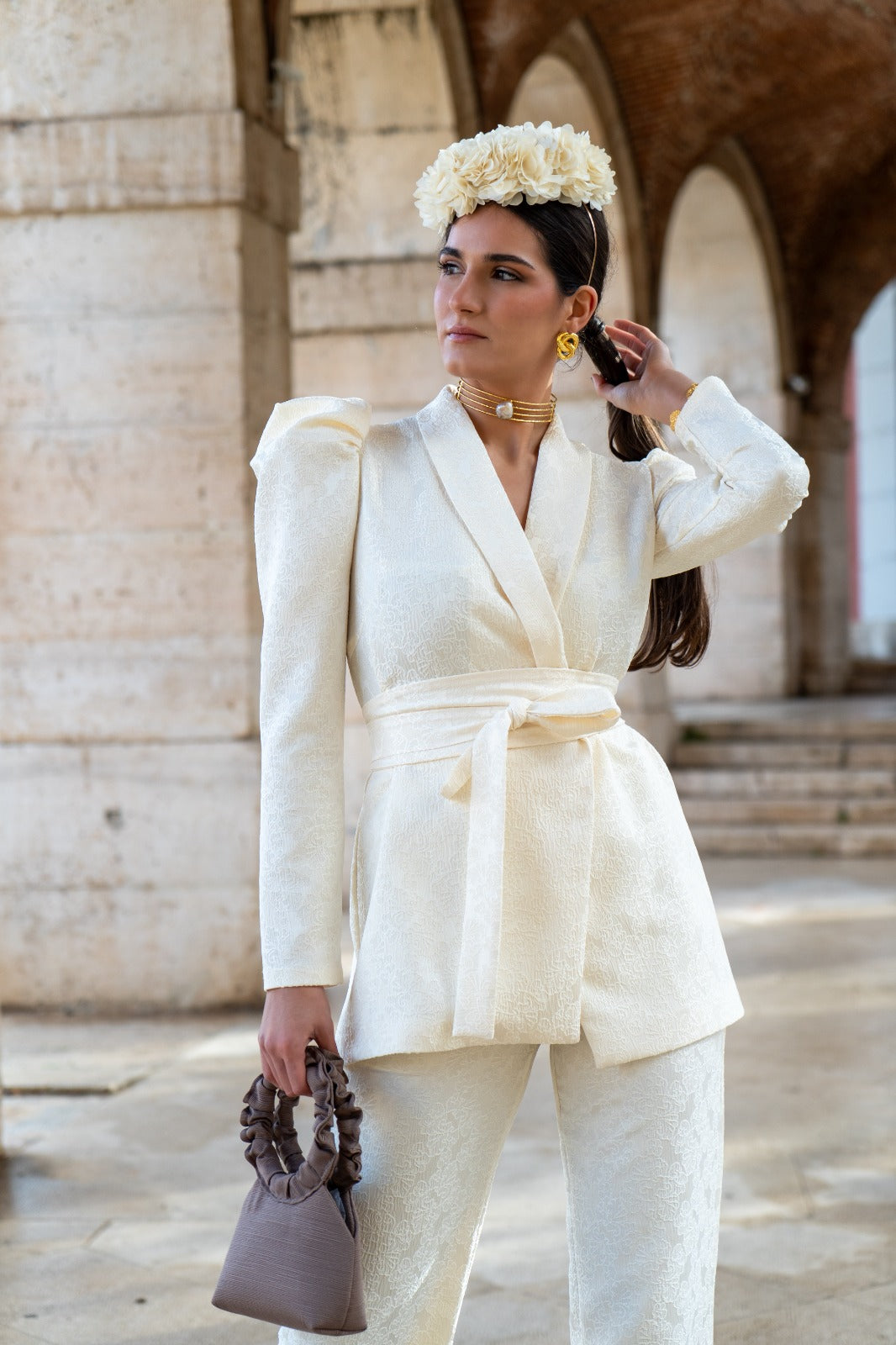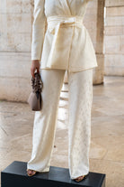 A matching set consisting of a double-breasted jacket with long, puffed sleeves and straight-leg, high-waisted trousers. In beige with brocade detailing.