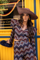 Set consisting of a long-sleeved jacket with shoulder flaps, a V-neck, and a front button closure, paired with high-waisted, slim-fit trousers. Multicolor print.