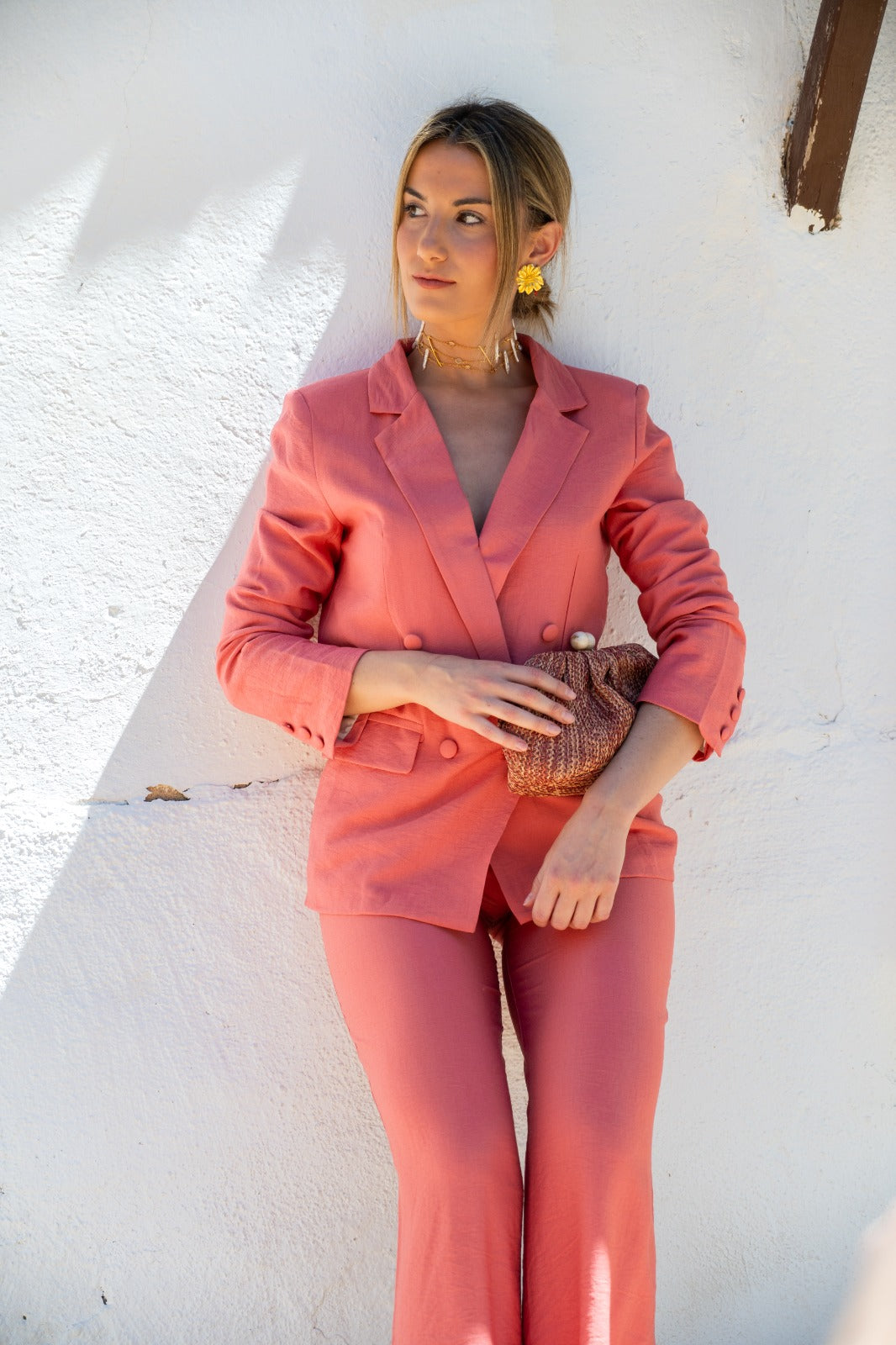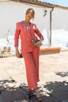 Set consisting of a long-sleeved, double-breasted jacket and high-rise trousers with a waistband and side pockets. In coral.