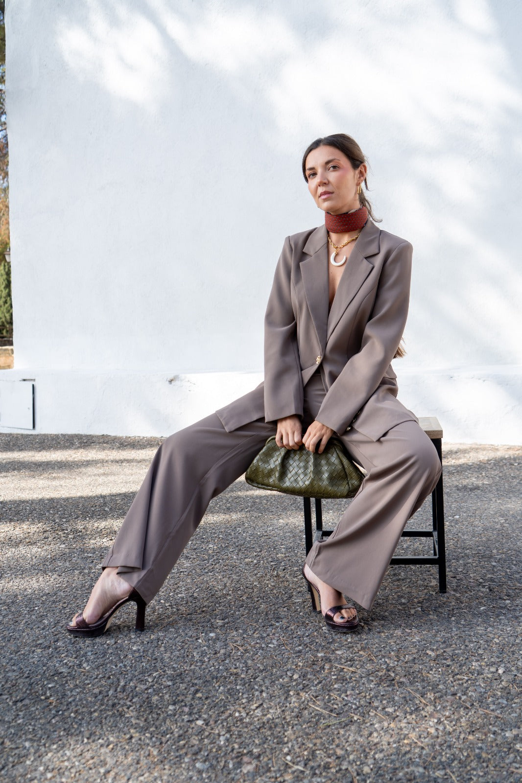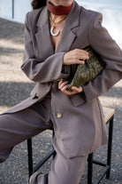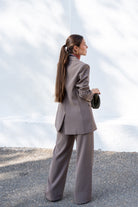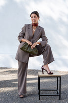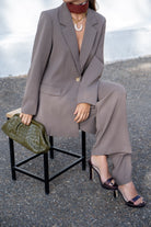 Set consisting of a jacket with a lapel collar and front pockets, and wide-leg trousers with side pockets. Flowy fabric in green.
