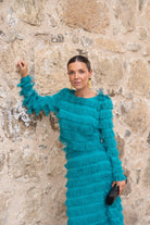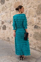 Set consisting of a round-neck, long-sleeved top and a high-waisted, A-line skirt. With green fringe.